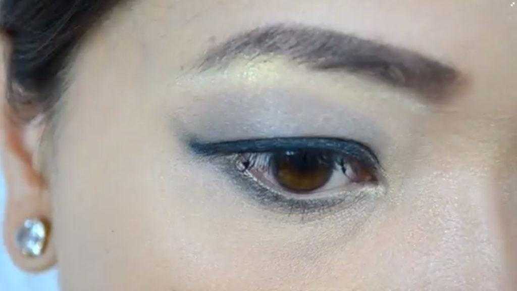 Далее уже сформированные линии покрываются черными тенями. Выполняя похлопывающие движения кистью, можно предотвратить осыпание материала. Если слой кажется слишком темным, его можно аккуратно разбавить серыми тенями. Растушевка позволит заполнить пустоты, неизменно образующиеся на верхнем веке. Темную нижнюю линию соединяют с внешним уголком.
