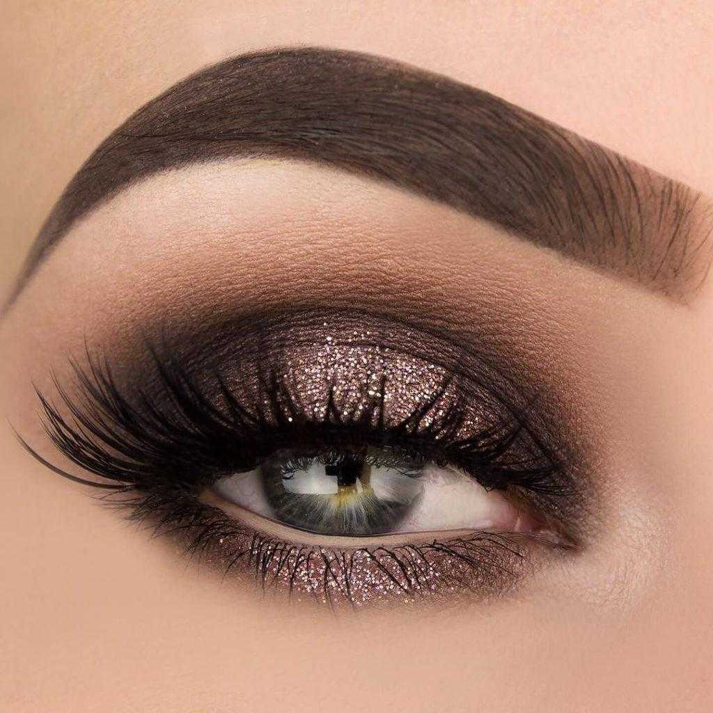 Чтобы сделать вечерний макияж смоки, можно добавить слой блесток на темной базе. Ими покрывают подвижное веко по направлению от внутреннего угла, не доходя до внешнего – зона с яркой черной тушью может быть оставлена в первоначальном виде. Чтобы блестки не осыпались на верхнюю часть щек, воспользуйтесь специальными защитными накладками.