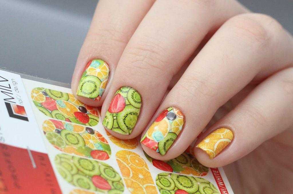Еще один способ нанести стильный фруктовый рисунок на ноготки – воспользоваться стемпингом. Чаще всего на пластинах есть различные фрукты, в том числе по размеру. Поэтому подобрать подходящий вариант совсем не сложно. Что касается нанесения, то лучше вначале потренироваться переносить рисунок на бумагу. Только тогда, когда он будет четким, приступайте к дизайну ногтей. Кстати нейл-мастера рекомендуют после нанесения его дополнительно раскрасить. Тогда фрукт будет более реалистичным.