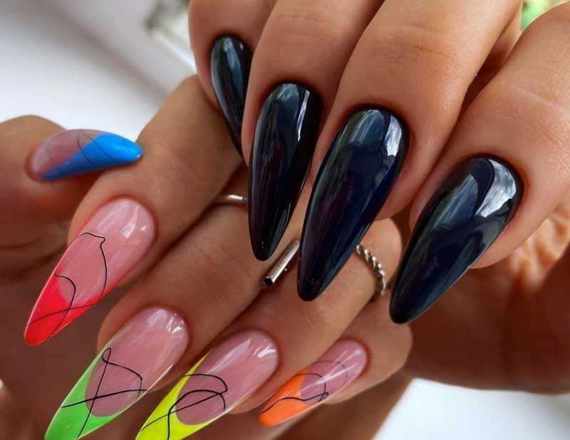 Миндалевидные ноготки — женственно и романтично. Многим кажется, что для такой формы не очень подходит мрачный лак черного оттенка. Это не так. Но если вы сторонница такого мнения, просто используйте различные сочетания цветов. Например, классическое — черный с белым, черный с красным, розовым, голубым, серебром или золотом. Несомненный плюс черного лака в его универсальности. Это цвет-база, который может сочетаться с самыми смелыми и необычными цветами. И от этого маникюр только выигрывает.