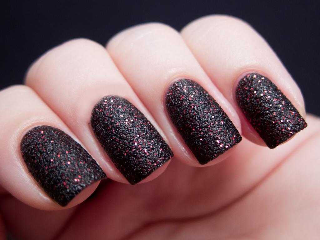 На ногтях создается эффект каменного покрытия. Черный маникюр с блестками плоскими и объемными создаст иллюзию гранитного напыления.