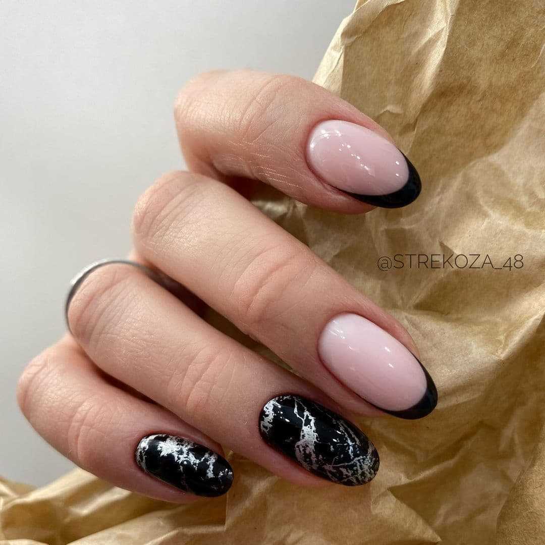 Мрамор — один из самых благородных и элегантных дизайнов маникюра, который особенно стильно смотрится в исполнении черного цвета. При этом ты можешь выбрать один из нескольких вариантов использования этого цвета: либо сделать бело-золотые разводы на черном фоне, либо наоборот, заполнить светлый бэкграунд серо-черными узорами. Кстати, мрамор — не только один из самых элегантных, но также один из самых простых в исполнении дизайнов.