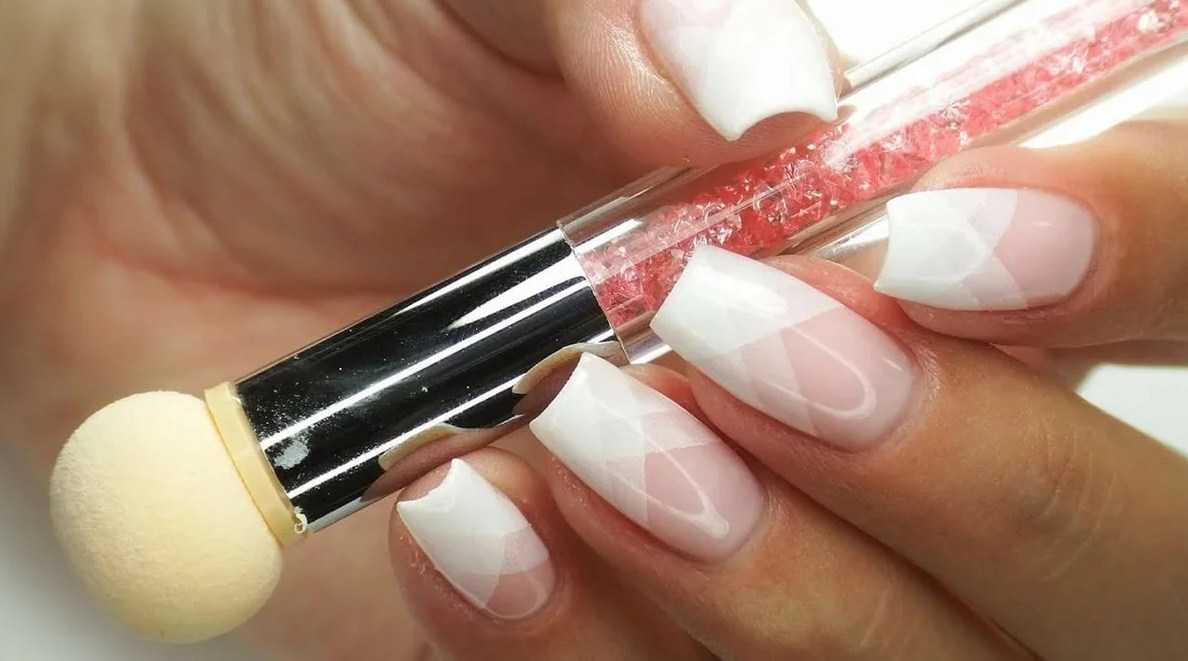 Аэропуфф. Инструмент помогает придать ноготкам эффект омбре с плавными цветовыми переходами. Он представляет собой специальный спонж в виде шара или кисточки с заострённым концом. Для работы с аэропуффом придётся заранее потренироваться в нанесении лаков.