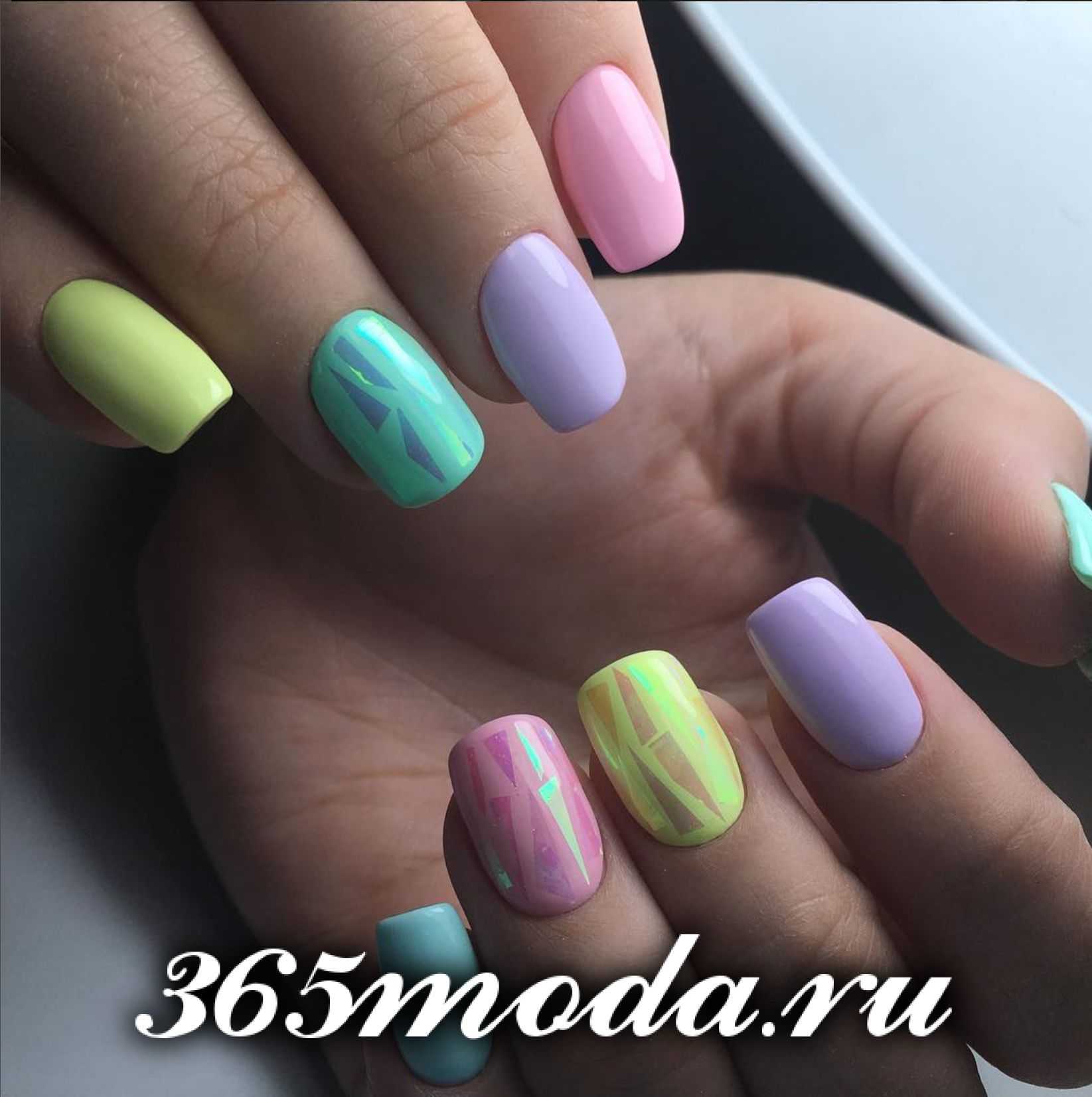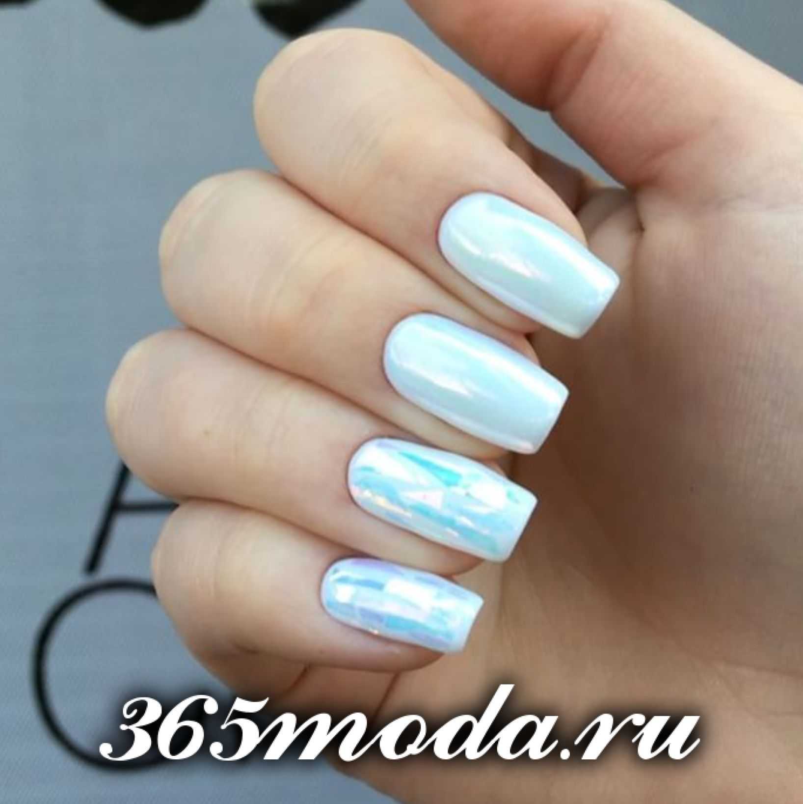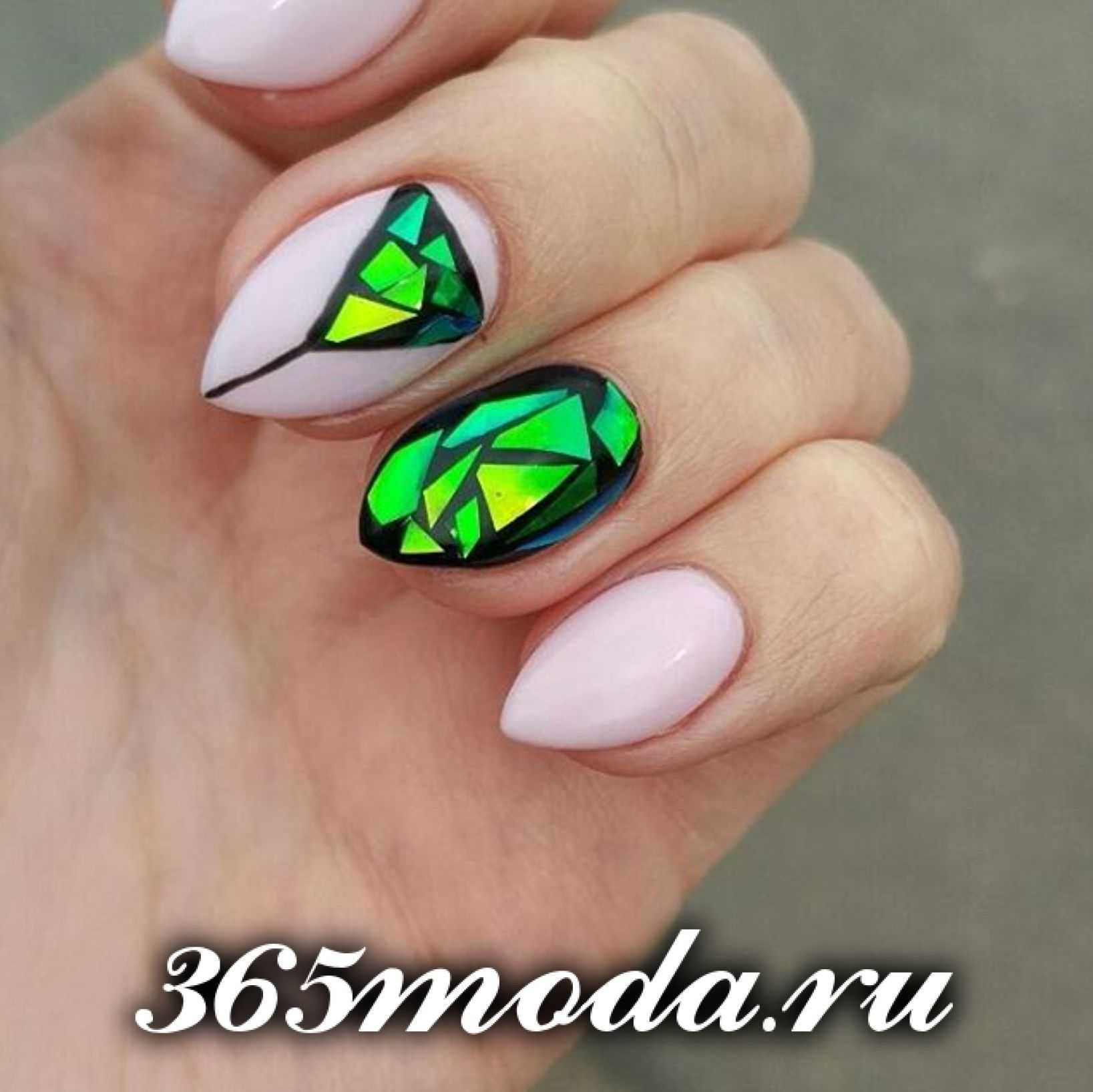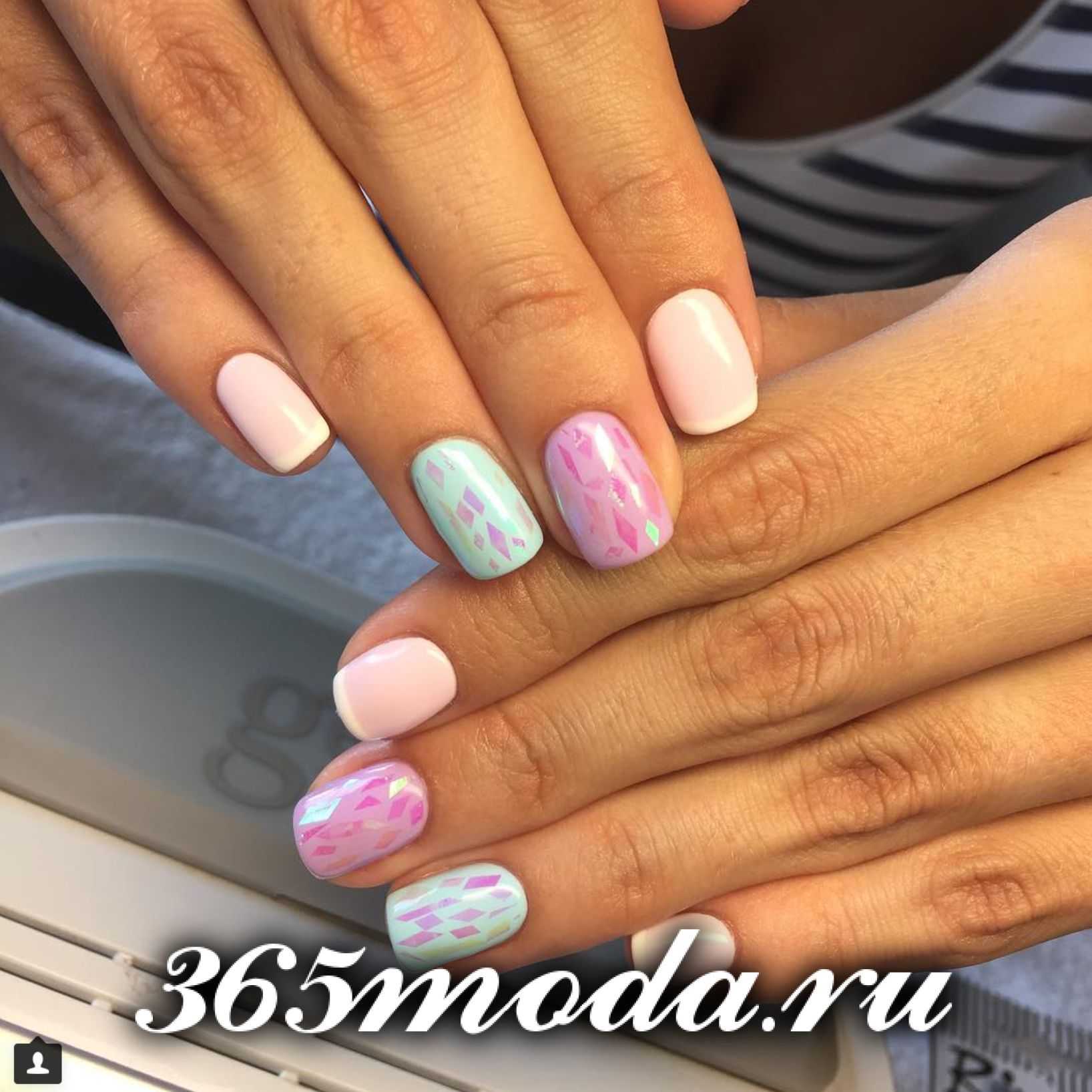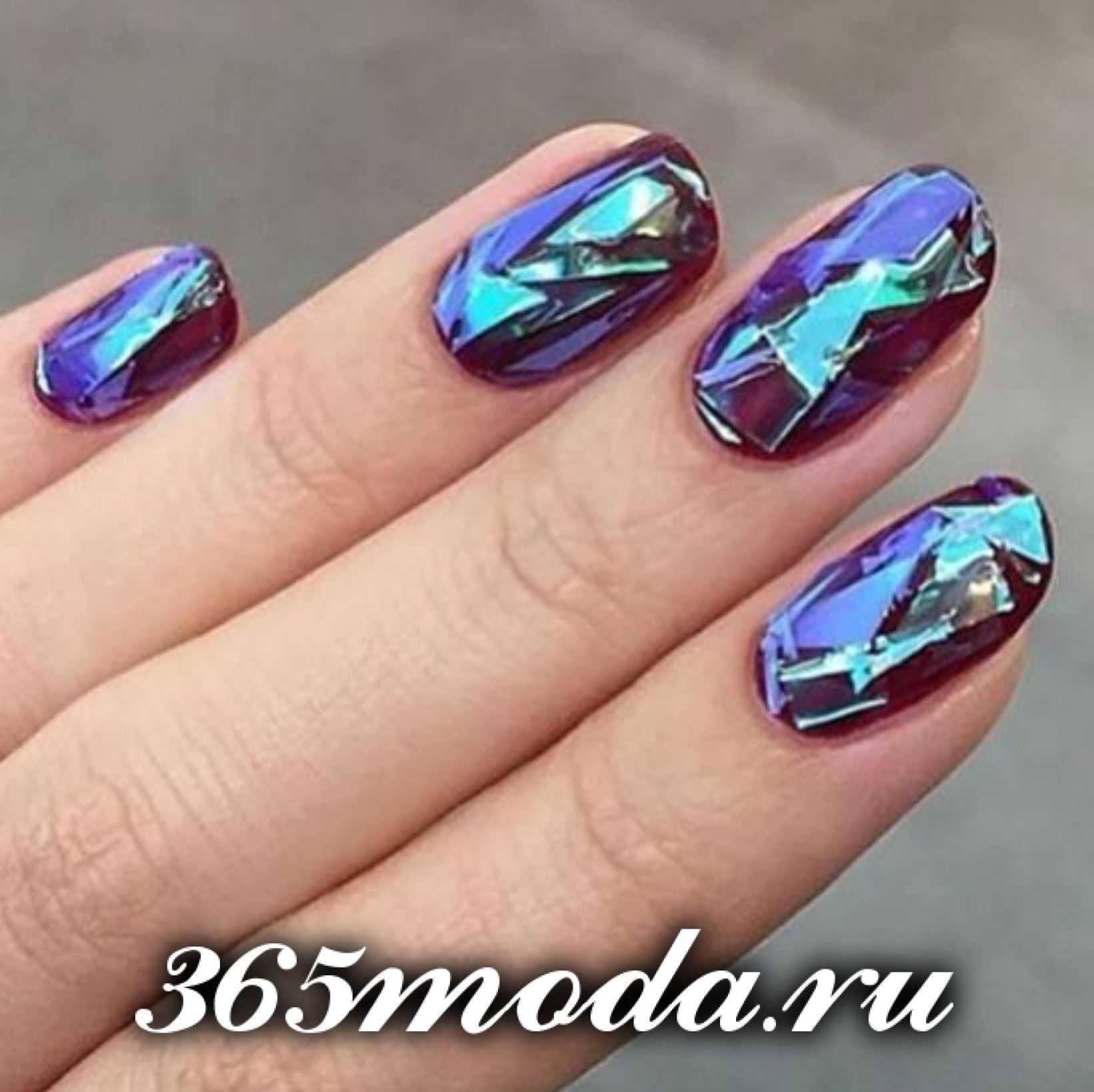 Для создания такого маникюра можно использовать слюду или специальную фольгу. Ее разрезают произвольными кусочками и, в зависимости от цвета лака, ваш маникюр всегда будет выглядеть по-разному. Можно создавать различные узоры, геометрические рисунки или просто делать россыпь.