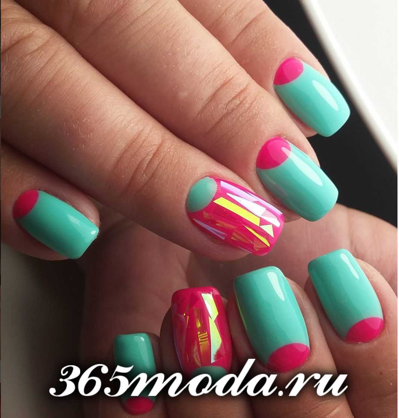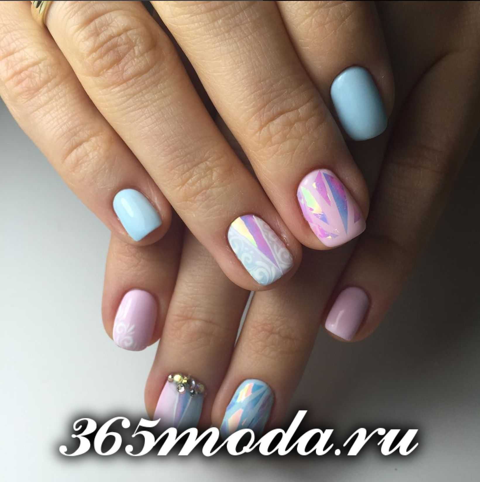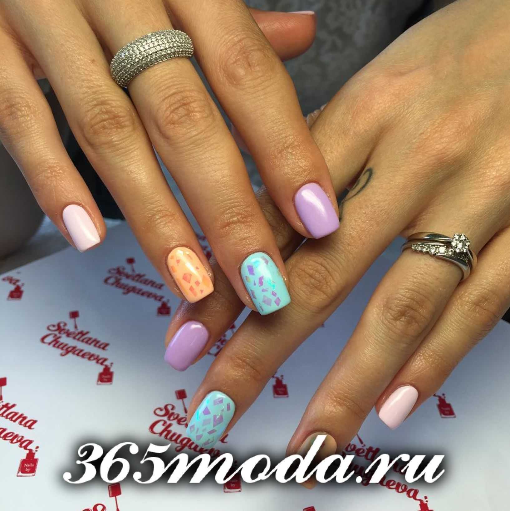 Необычный выразительный дизайн легко создать с применением потали или фольги. Поверх прозрачного покрытия в хаотичном порядке располагаются яркие пятна вперемешку с фольгой. Такой красивый дизайн точно не останется без внимания на вечеринке!