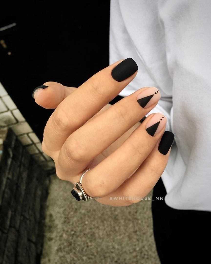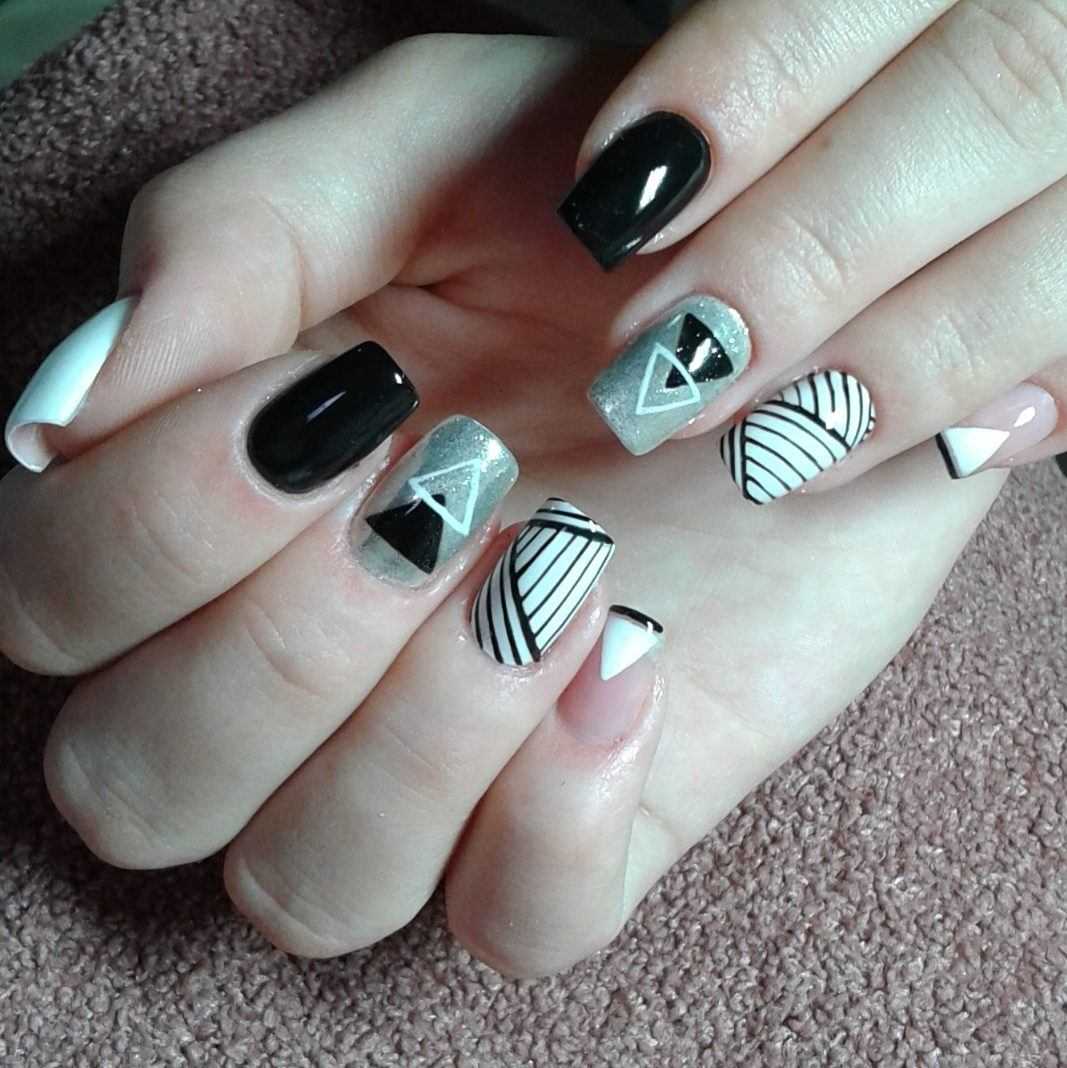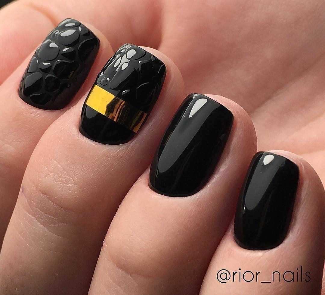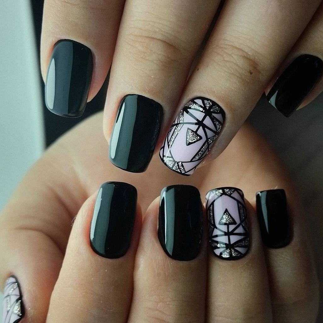 - Геометрия. Упорядоченные и хаотичные геометрические фигуры уже много сезонов не выходят из моды. Дизайн выполняется в минималистическом стиле. Именно глубина черного дает приятную лаконичность, естественность. Универсальный маникюр, подходит на все случаи жизни.