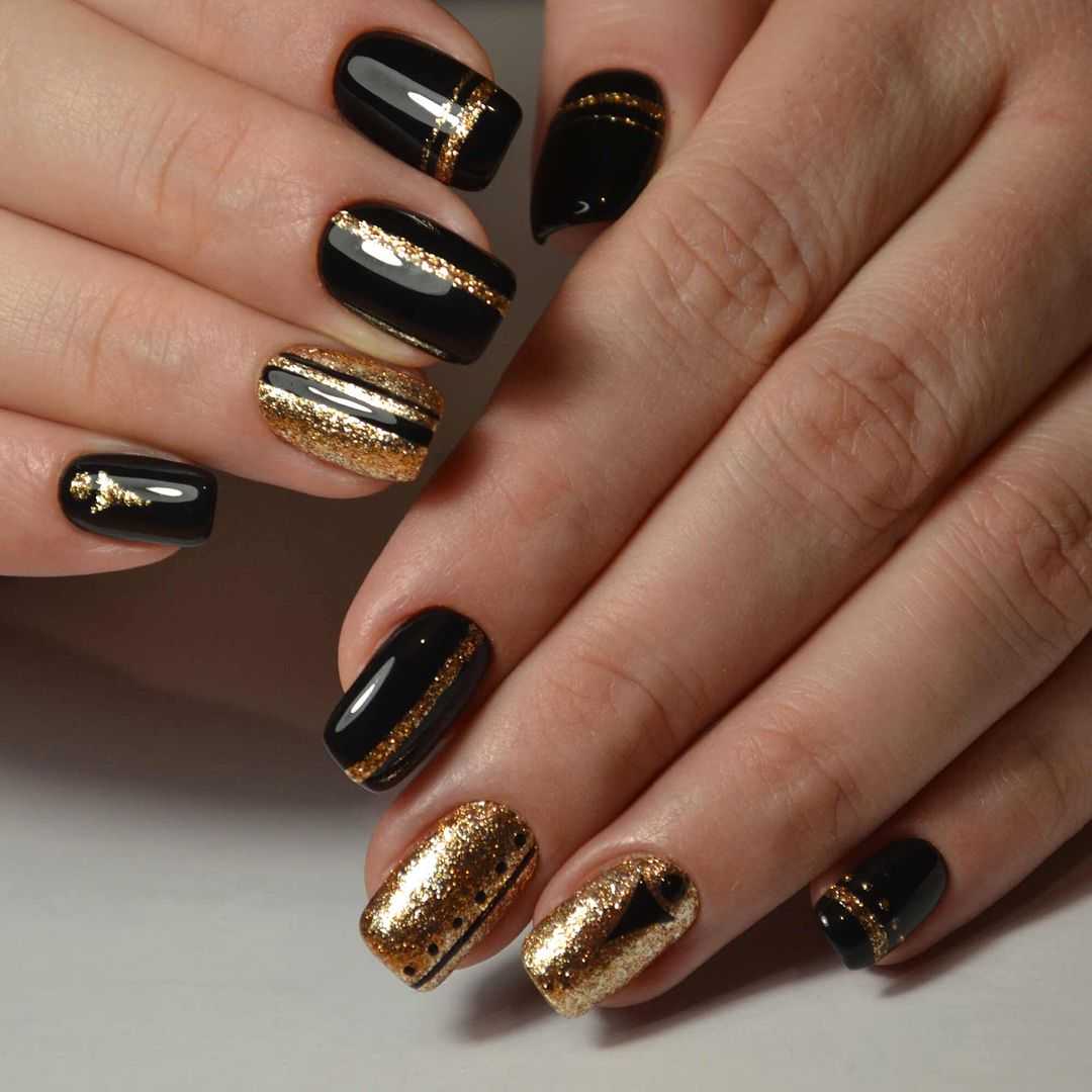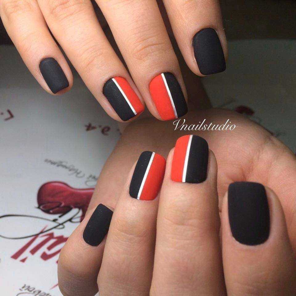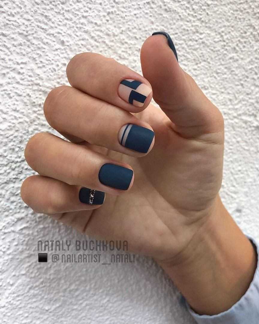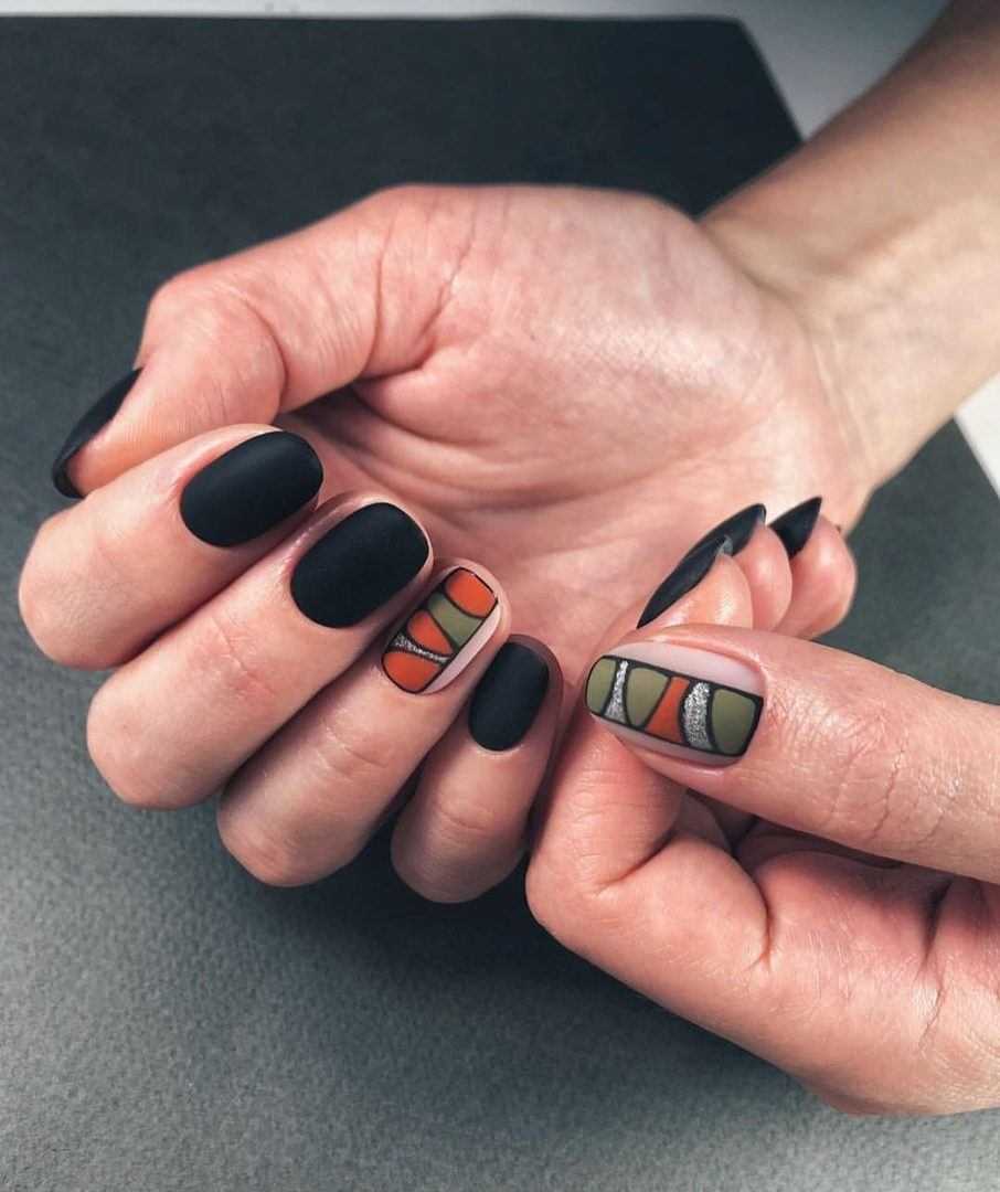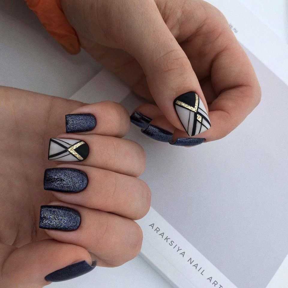 - Геометрия. Упорядоченные и хаотичные геометрические фигуры уже много сезонов не выходят из моды. Дизайн выполняется в минималистическом стиле. Именно глубина черного дает приятную лаконичность, естественность. Универсальный маникюр, подходит на все случаи жизни.