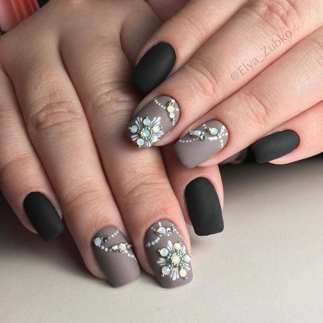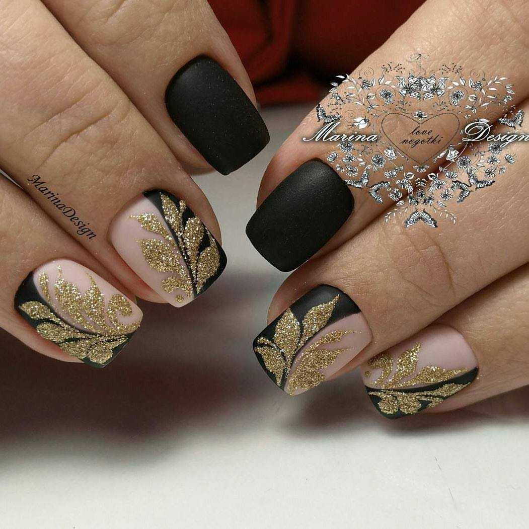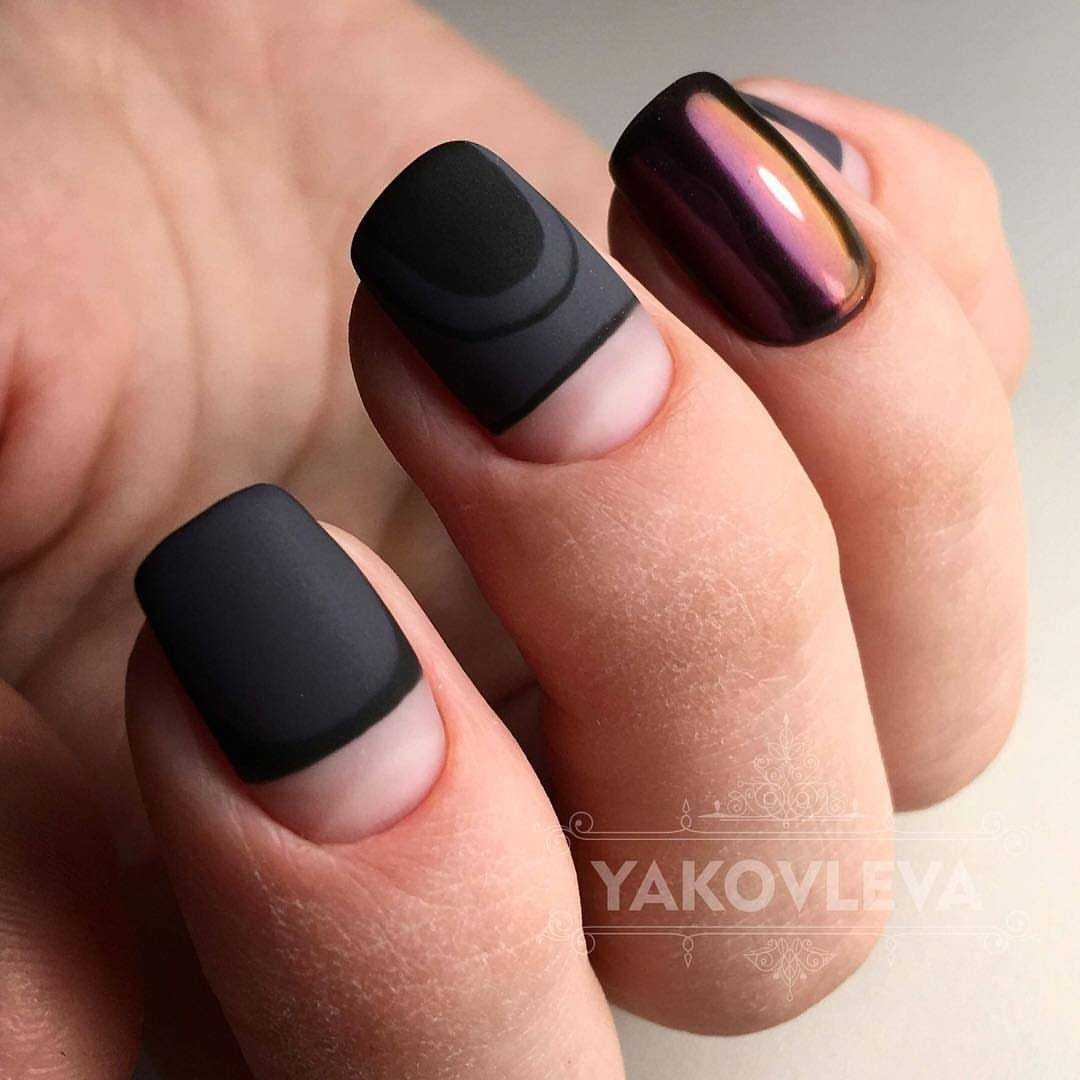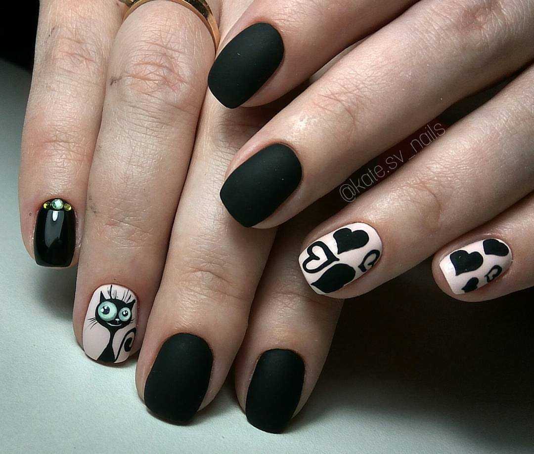 - Матовый. Интересный дизайн получится, если ноготки покрасить черным гель-лаком с матовым покрытием и по 2 пластины на каждой руке оформить глянцевым бежевым. Матовость можно дополнить светлыми вензелями, изогнутыми линиями.
