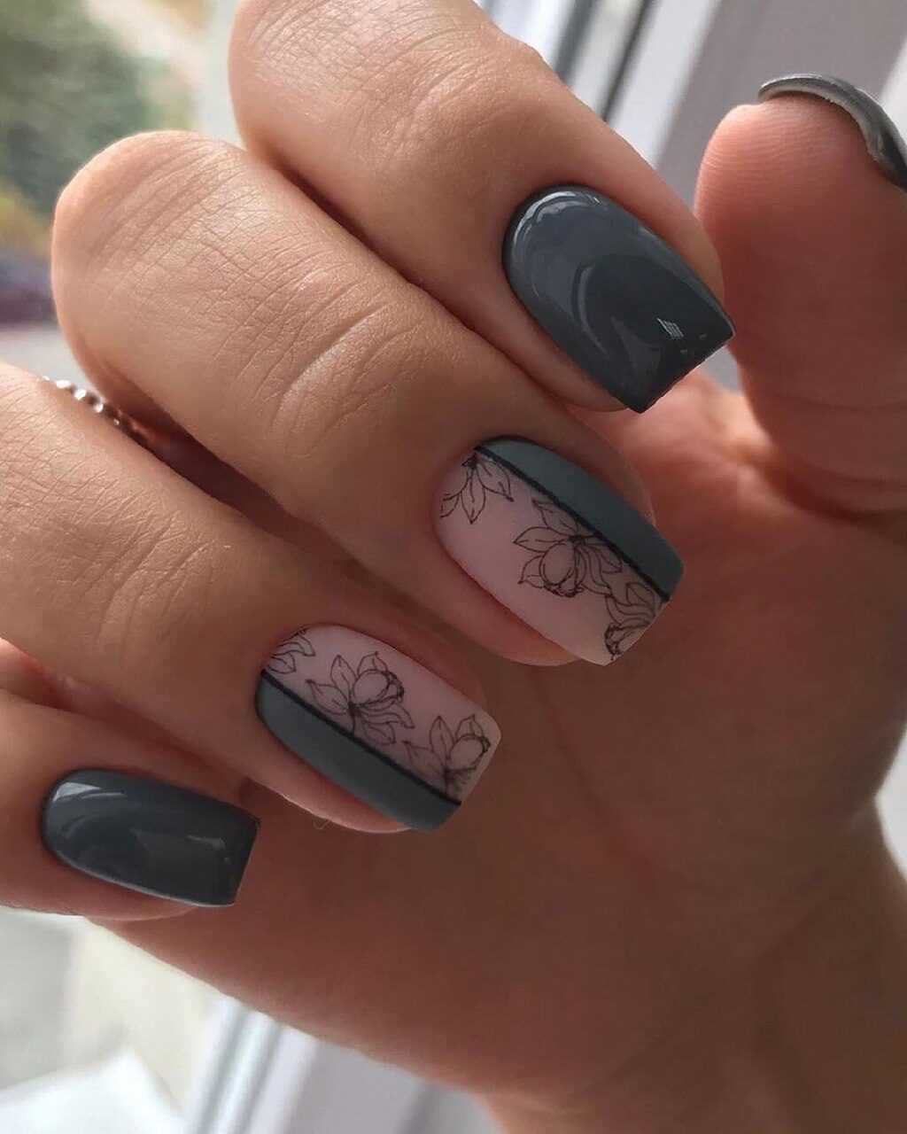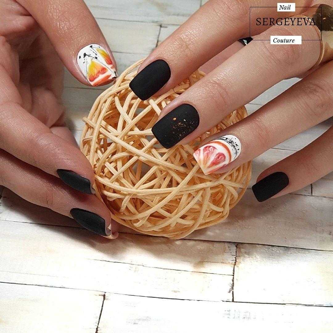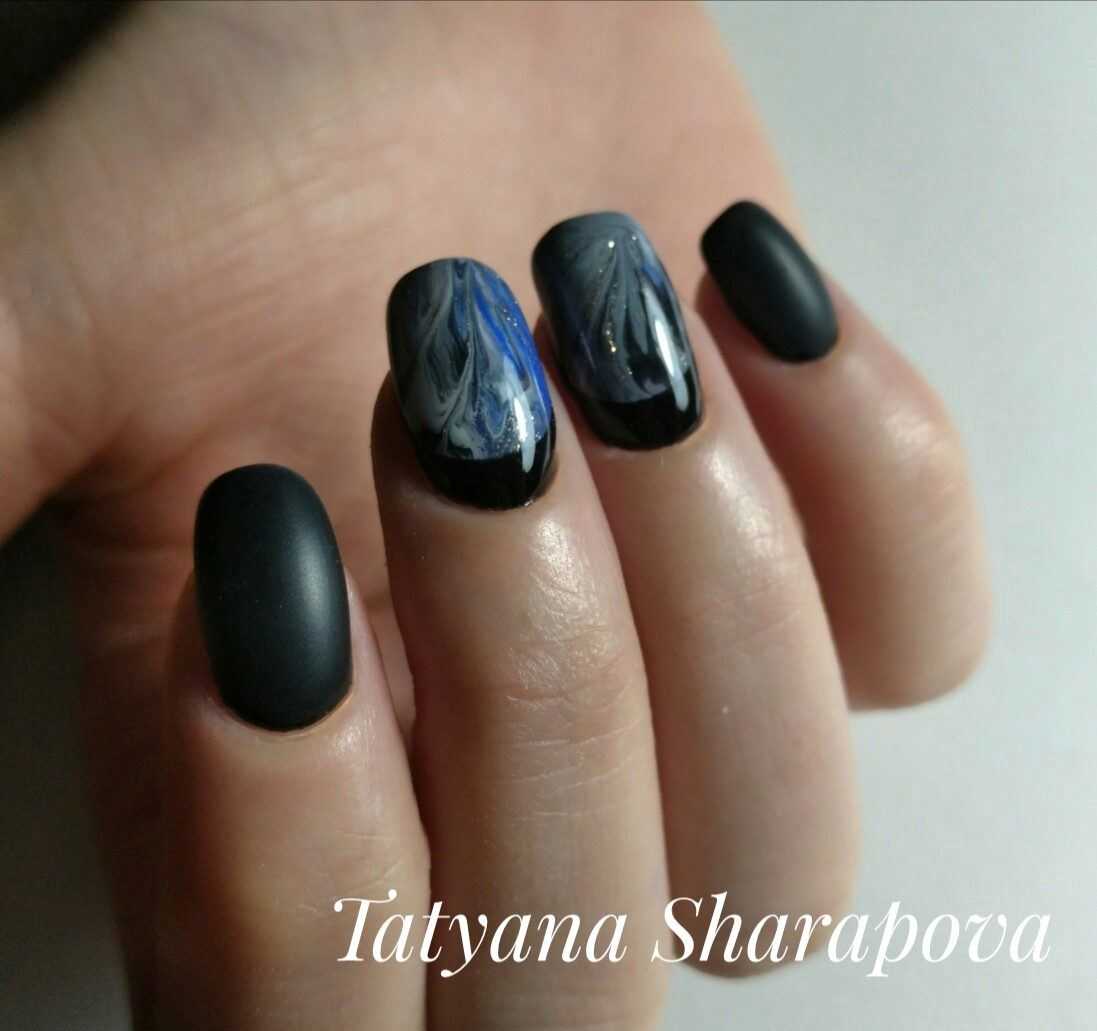 - Матовый. Интересный дизайн получится, если ноготки покрасить черным гель-лаком с матовым покрытием и по 2 пластины на каждой руке оформить глянцевым бежевым. Матовость можно дополнить светлыми вензелями, изогнутыми линиями.