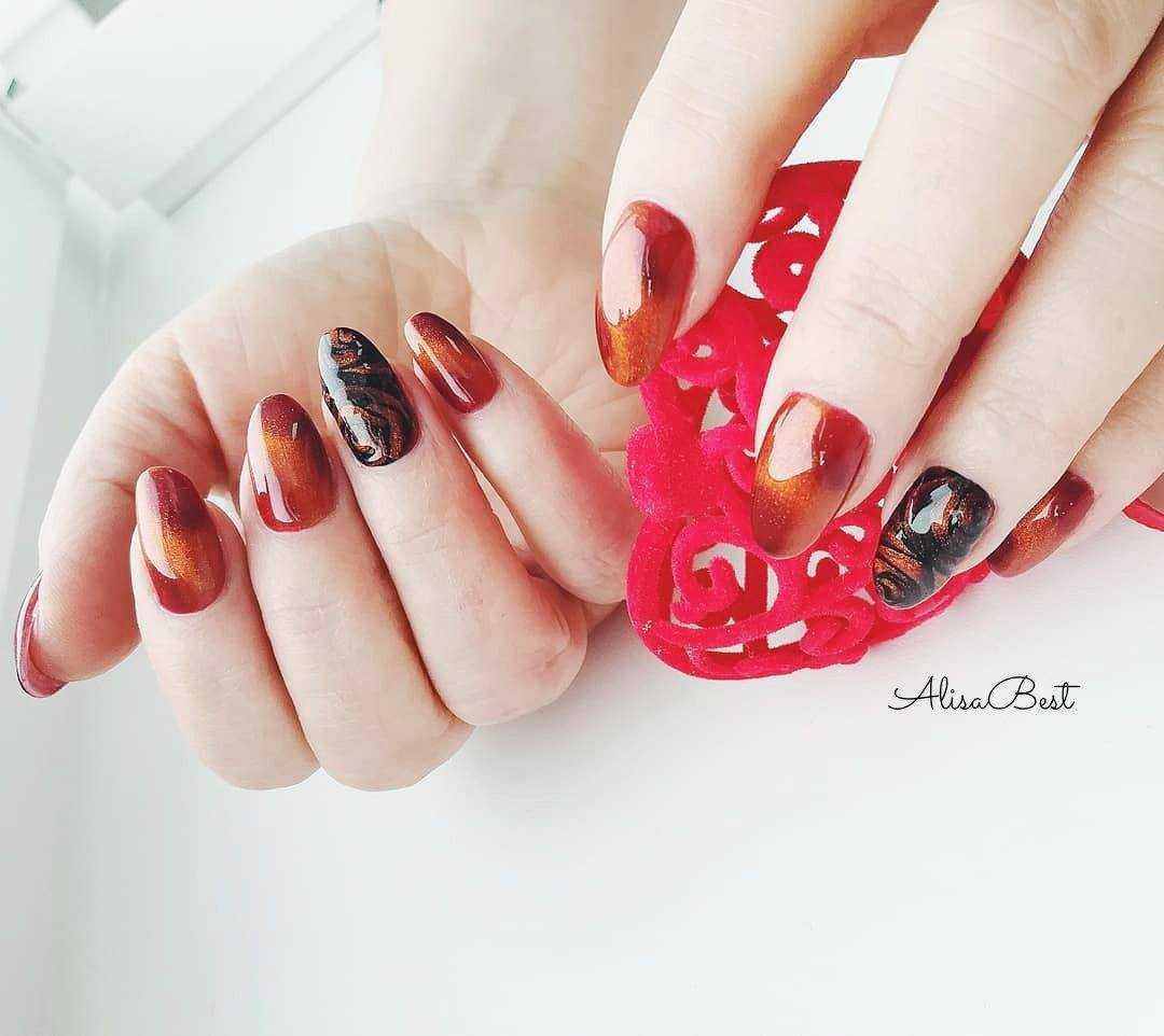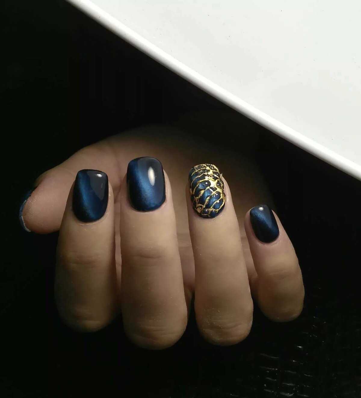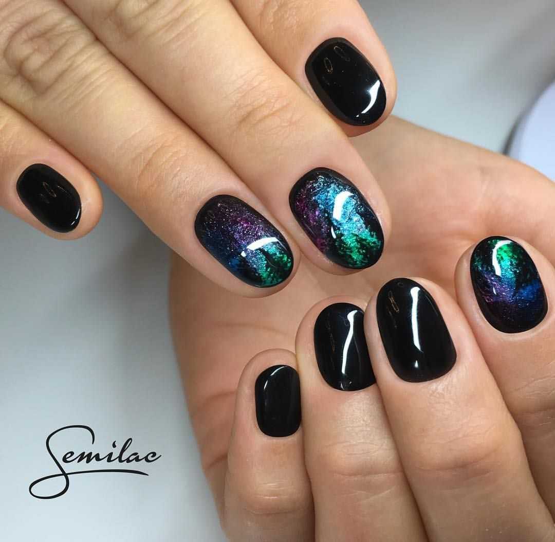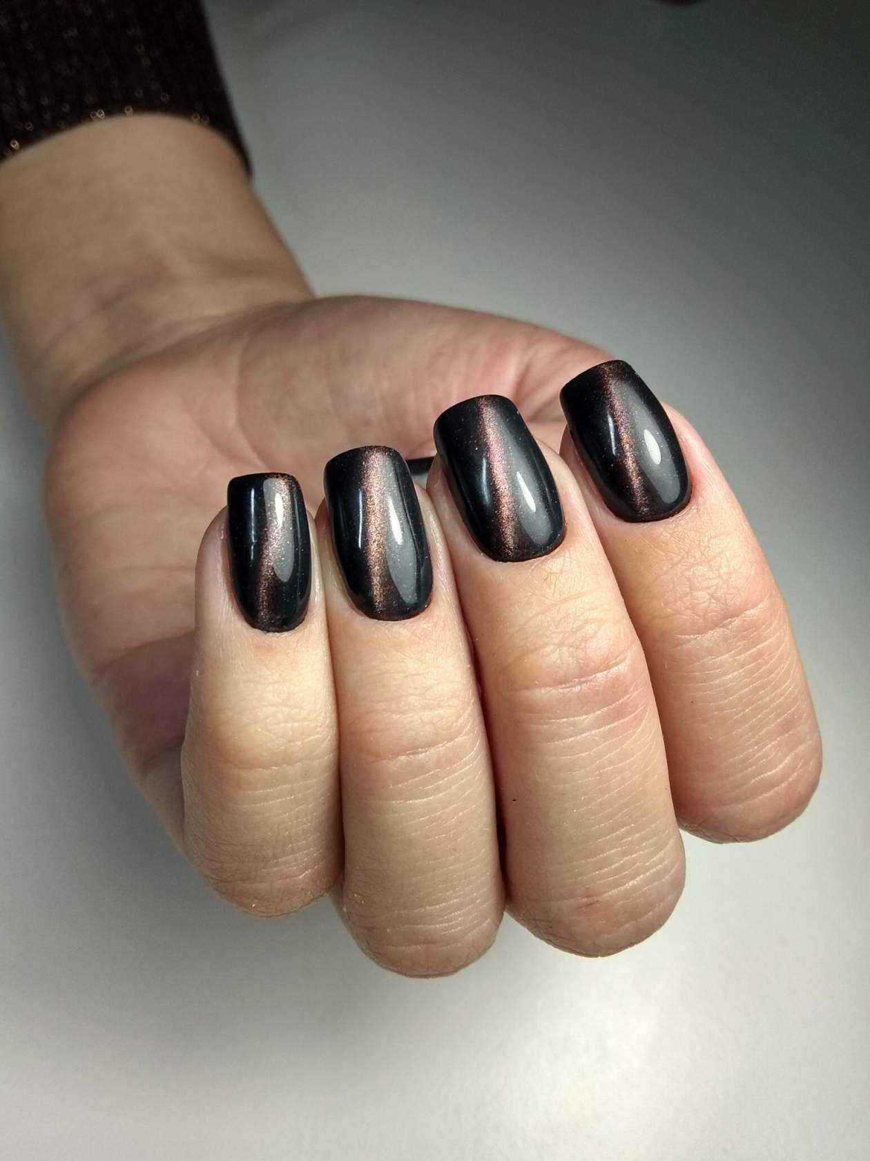 Лаки серии «кошачий глаз» невероятно притягательно выглядят на темном покрытии. Подчеркнут образ узоры из фольги, дизайн в стиле «вселенная», витражные композиции. Выполняют маникюр в разных исполнениях. Это может быть бордо, темно-синий, темно-фиолетовый, изумрудный