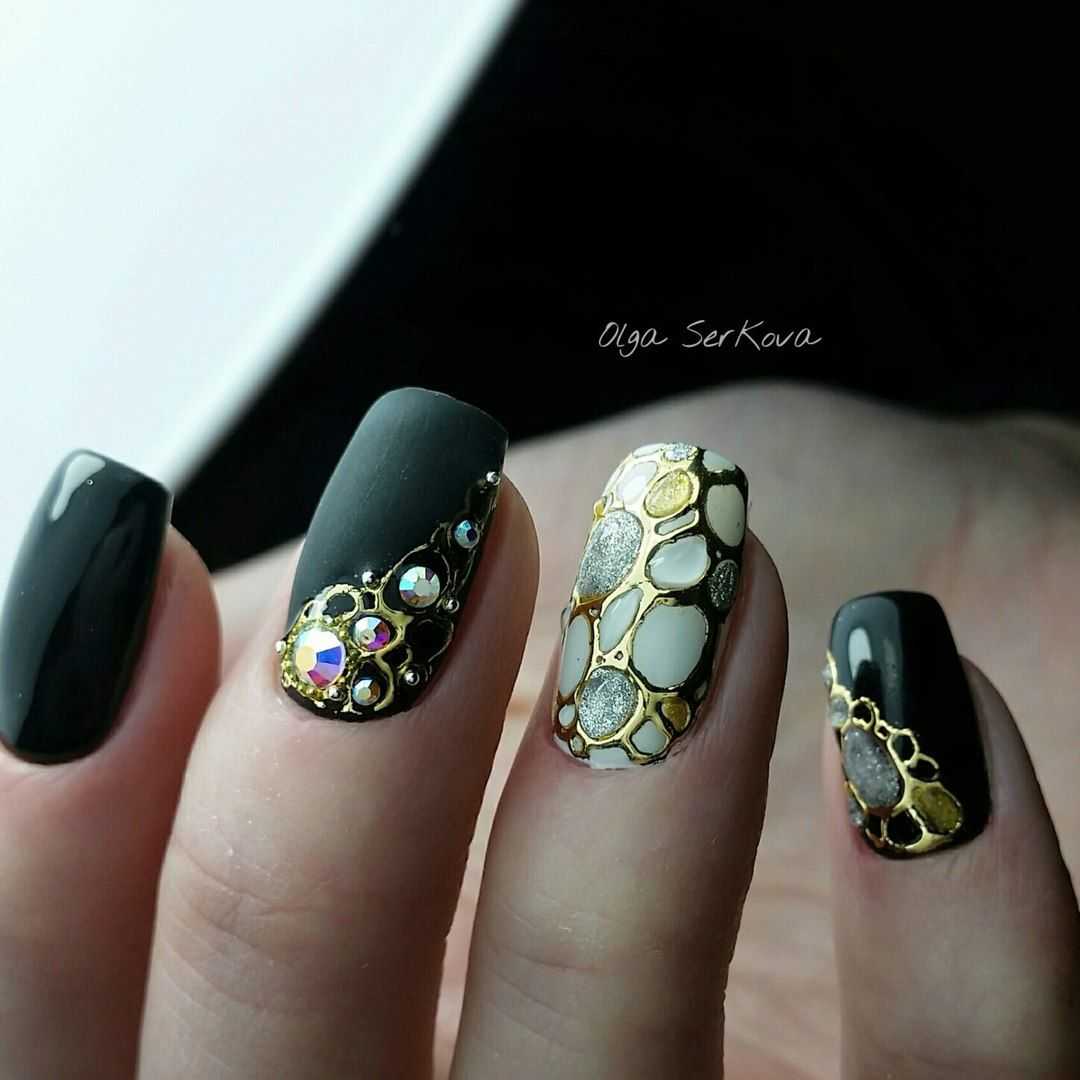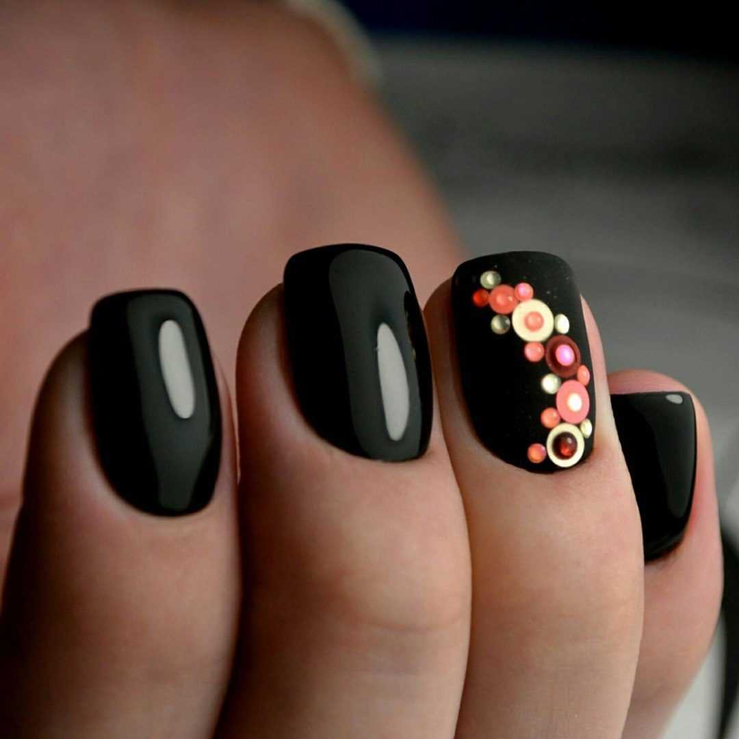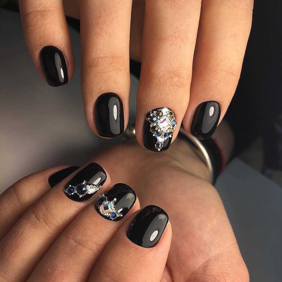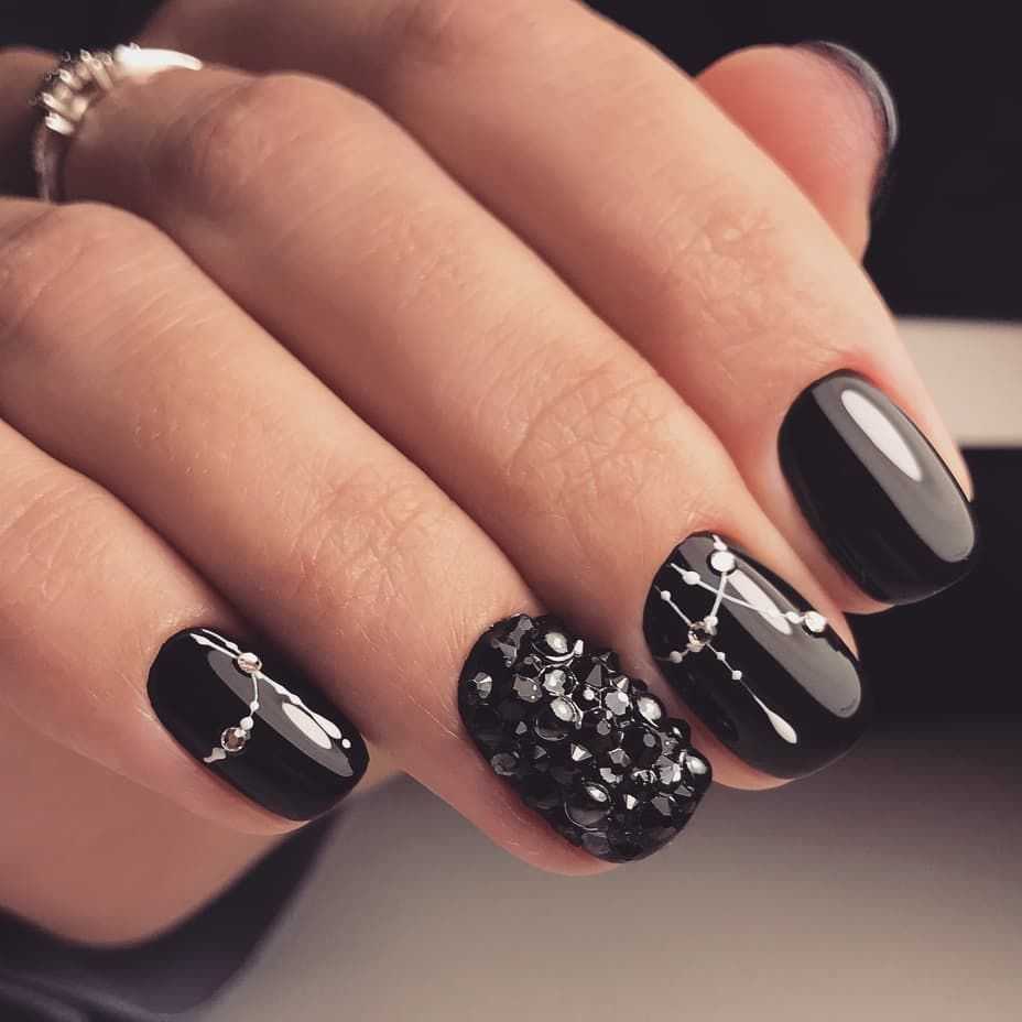 - Черный маникюр со стразами, выложенными в определенный рисунок, выглядит особо экстравагантно. Предпочтение отдают самым миниатюрным стразам. Особый изыск – сочетание глянцевого черного полотна и деликатных узоров из маленьких жемчужин;