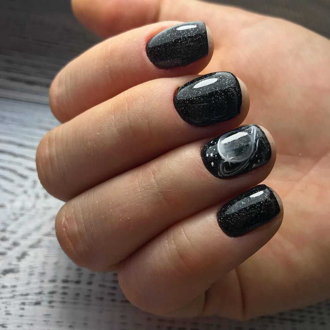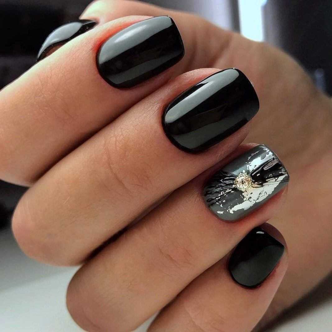 - Черный маникюр на короткие ногти можно украсит при помощи современных техник – живописные и картинные способы нанесения сложных рисунков на безымянный и/или средний палец;