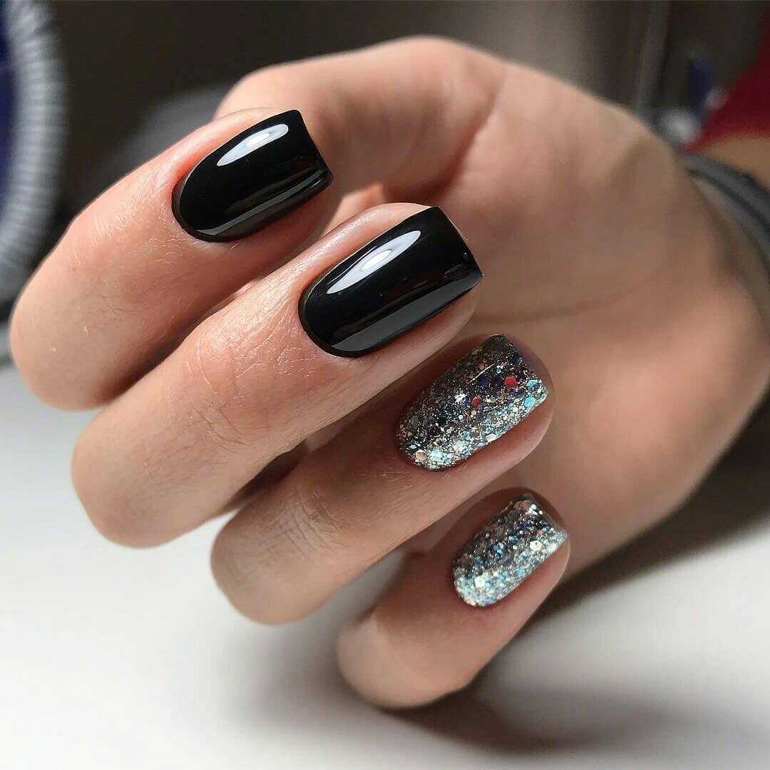 - Блестки, стразы. Сияющие элементы добавят торжественности строгим цветам. В 2022-2023 трендовые дизайны – лунообразная выкладка блесток вдоль основания пластины. Такая техника поможет визуально сузить широкие квадратные ногти. Чтобы не перегрузить маникюр, этот прием следует использовать на 1-2 пальцах на руке. Если черный и бежевый образуют линию перехода, ее можно обозначить мелкими стразами, бульонками.