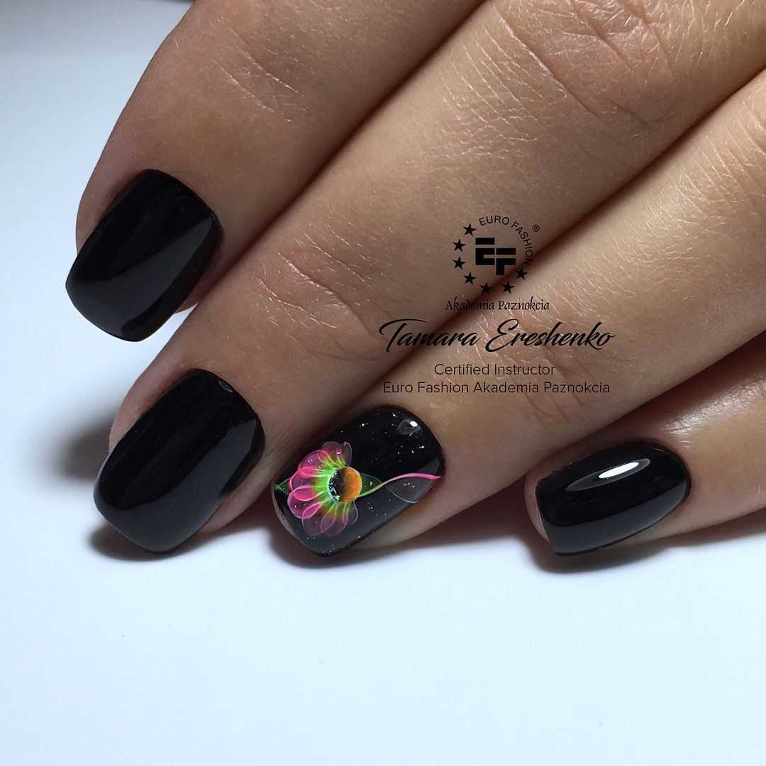 - Черный маникюр с цветами актуален и в глянцевом варианте. Однако в данном случае традиционные красные розы с успехом можно заменить нежно розовыми бутонами;