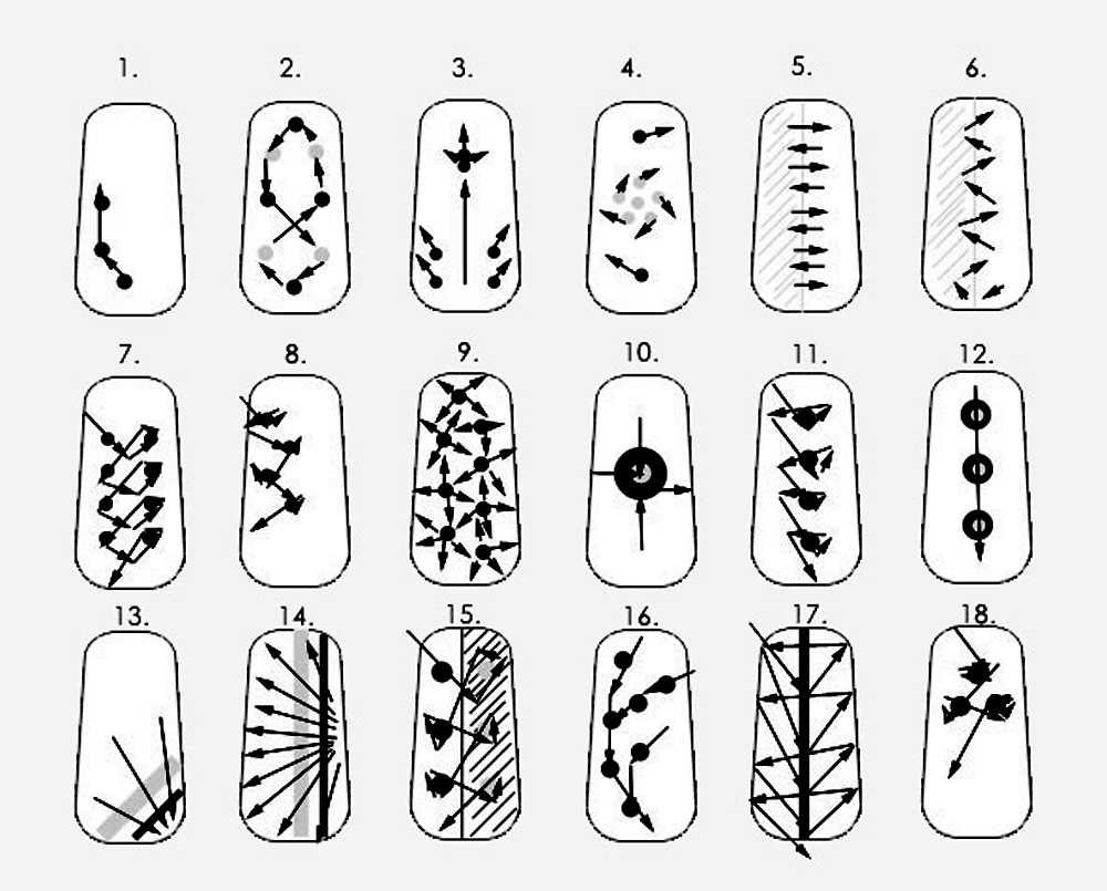 Форма ногтя должна быть зеркальным отражением линии кутикулы. Однако если она далека от идеальной, ее подравнивают, не закрашивая до конца боковые стороны ногтя. Рисунки, согласно модным тенденциям, сегодня не должны клонировать друг друга. Выбирается один главный, а остальные при этом являются его поддержкой и связкой с основной техникой маникюра, взятой за основу.
