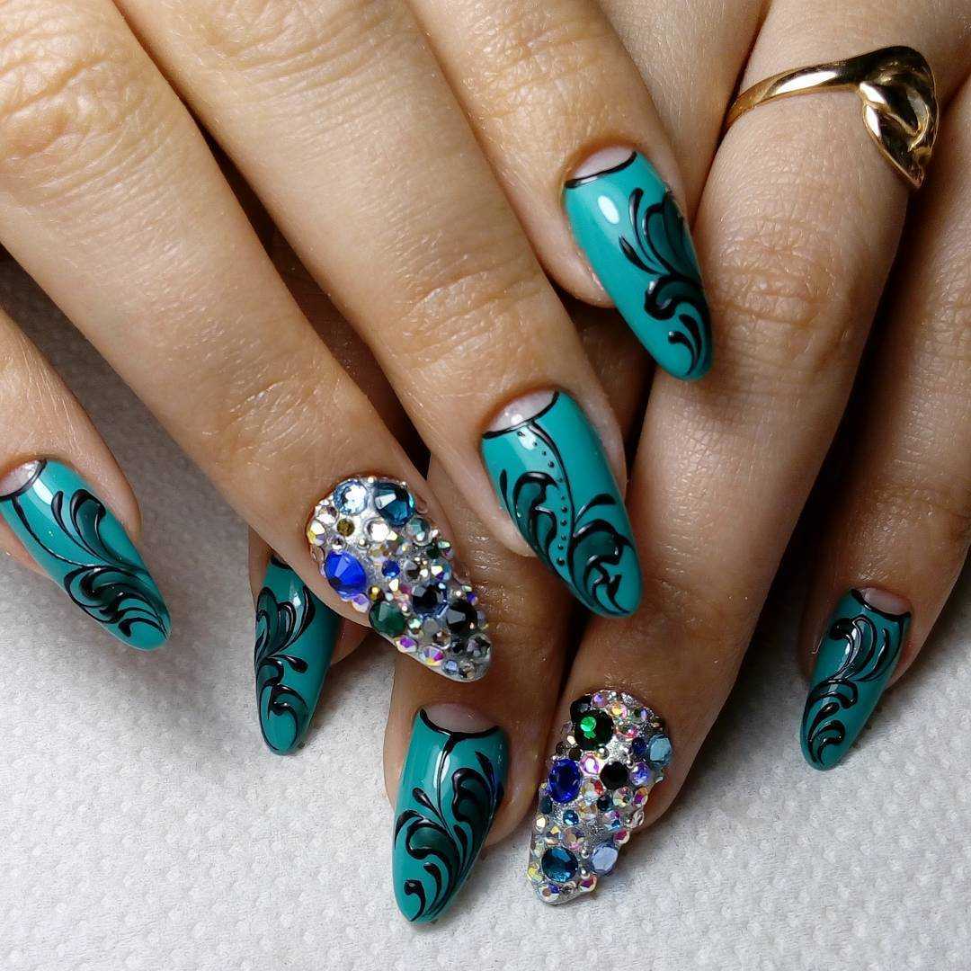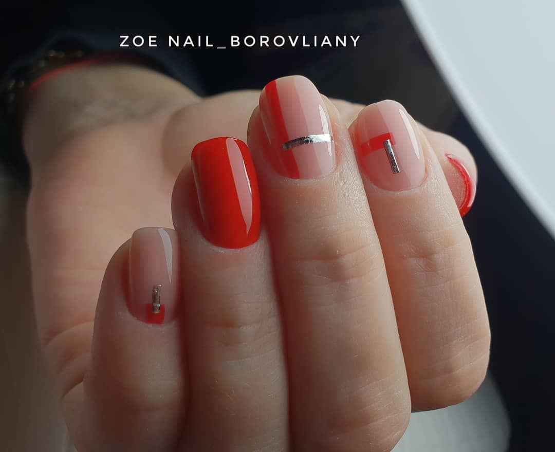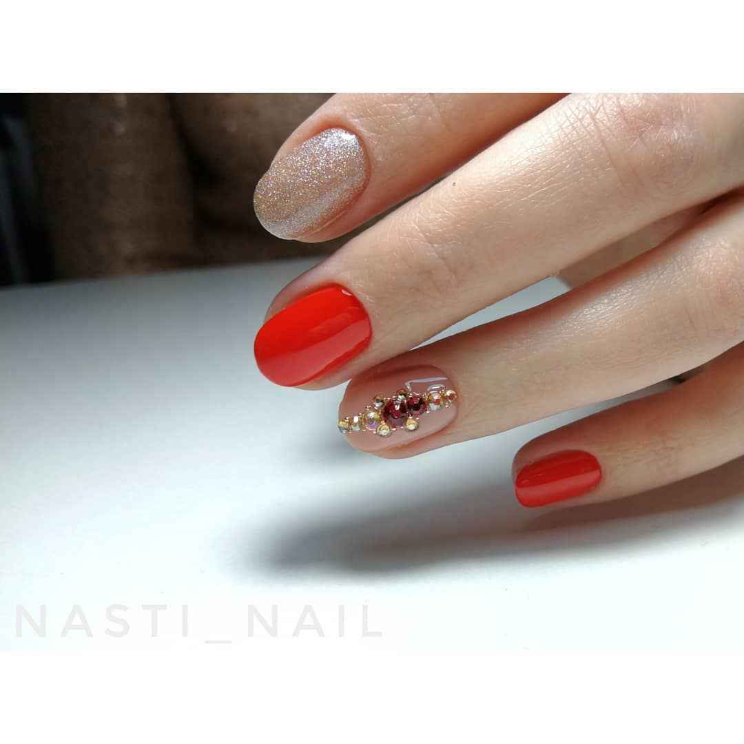 - если вы любите классику – выберите красный. Он удлинит ноготь, благодаря чему им можно покрывать все ложе. Добавьте изюминку: нанесите вензеля и украсьте их сверху стразами;