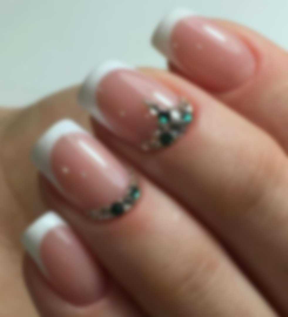 Использование различного рода блесток обязательно для французского маникюра на особый случай. Для торжественного, праздничного, вечернего, событийного френч-маникюра в этом году мастера нейл-арта рекомендуют модные дизайны с блестками. Классический французский маникюр эффектно дополнят и украсят золотая или серебристая улыбка-окантовка, сияющие стразы, блестящие бусины и декоративные камешки различной формы, цвета и размера. Очень популярны в 2022 году блестящие нейл-украшения из фольги (жидкой, голографической, самоклеящейся, жатой, зеркальной), потали, слюды, камифубуков.