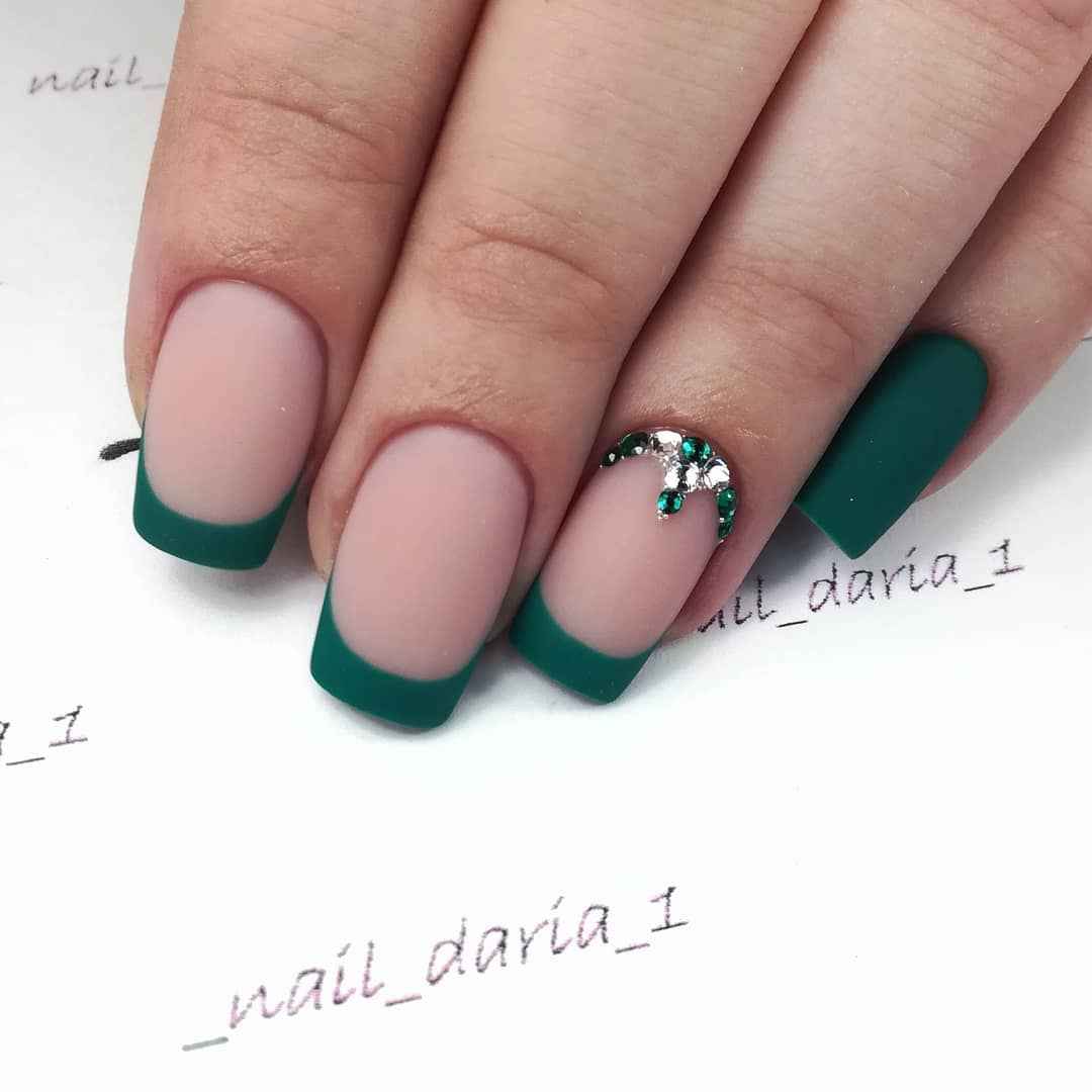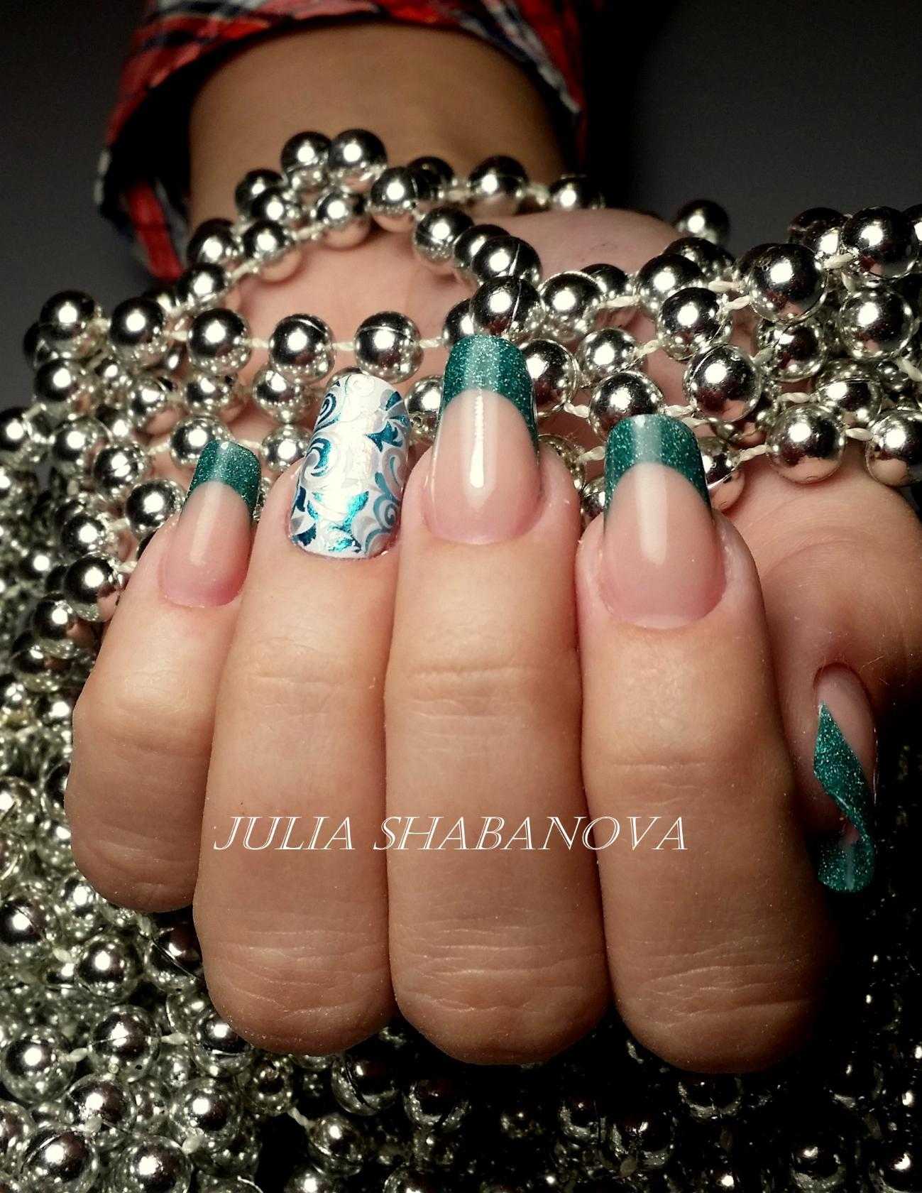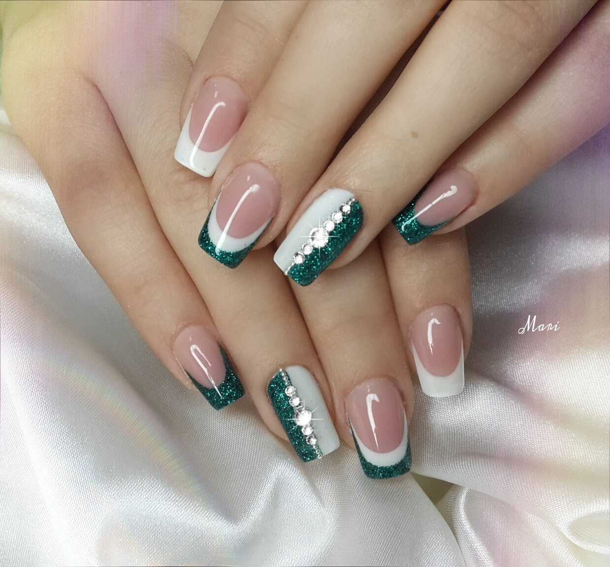 Как правило, в зеленом френче стразы размещают по краю ногтя, в области лунки или же покрывают весь ноготь. Стразы используют разнообразных цветов и разных форм. Главное правило, это учитывать длину ногтя. На короткие ногти не стоит применять большое количество блесток. Красиво и модно смотрится декор в стиле битого стекла. Такой маникюр создают с помощью разноцветной фольги в форме треугольников. Блестки используют сухие или жидкого вида. Блестками покрывают весь ноготь или же только лунку френча.