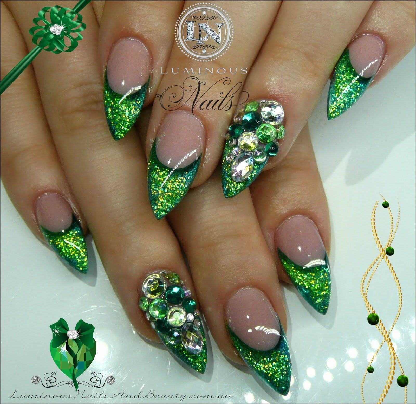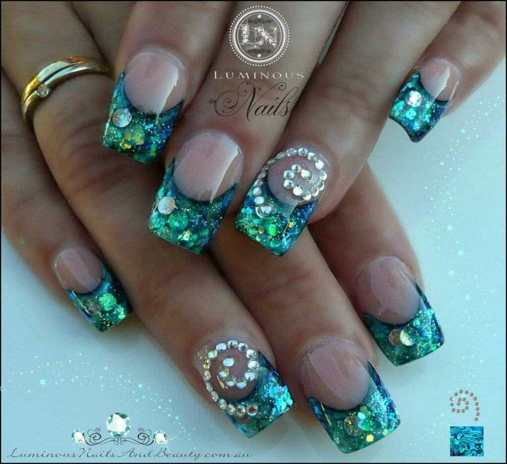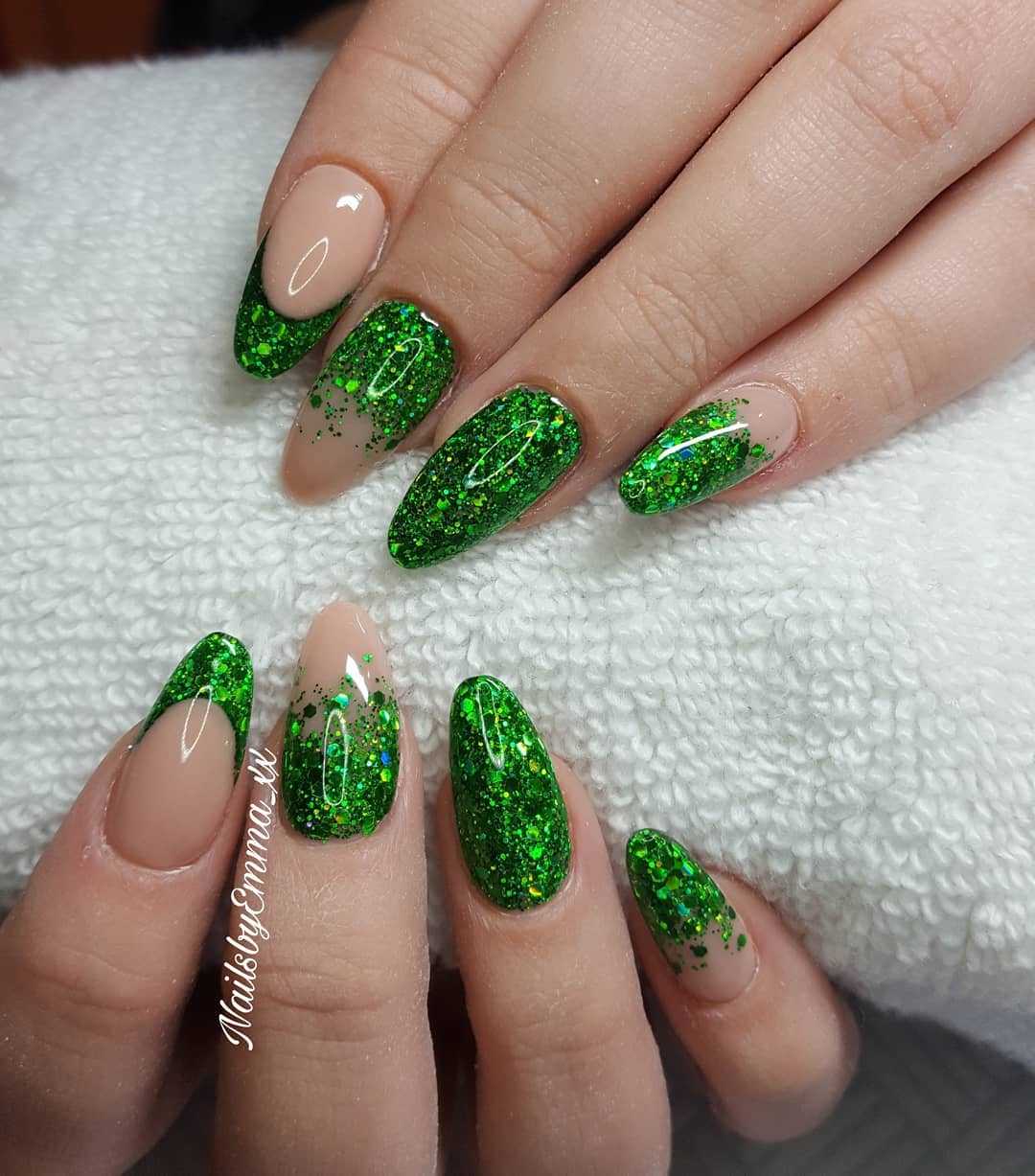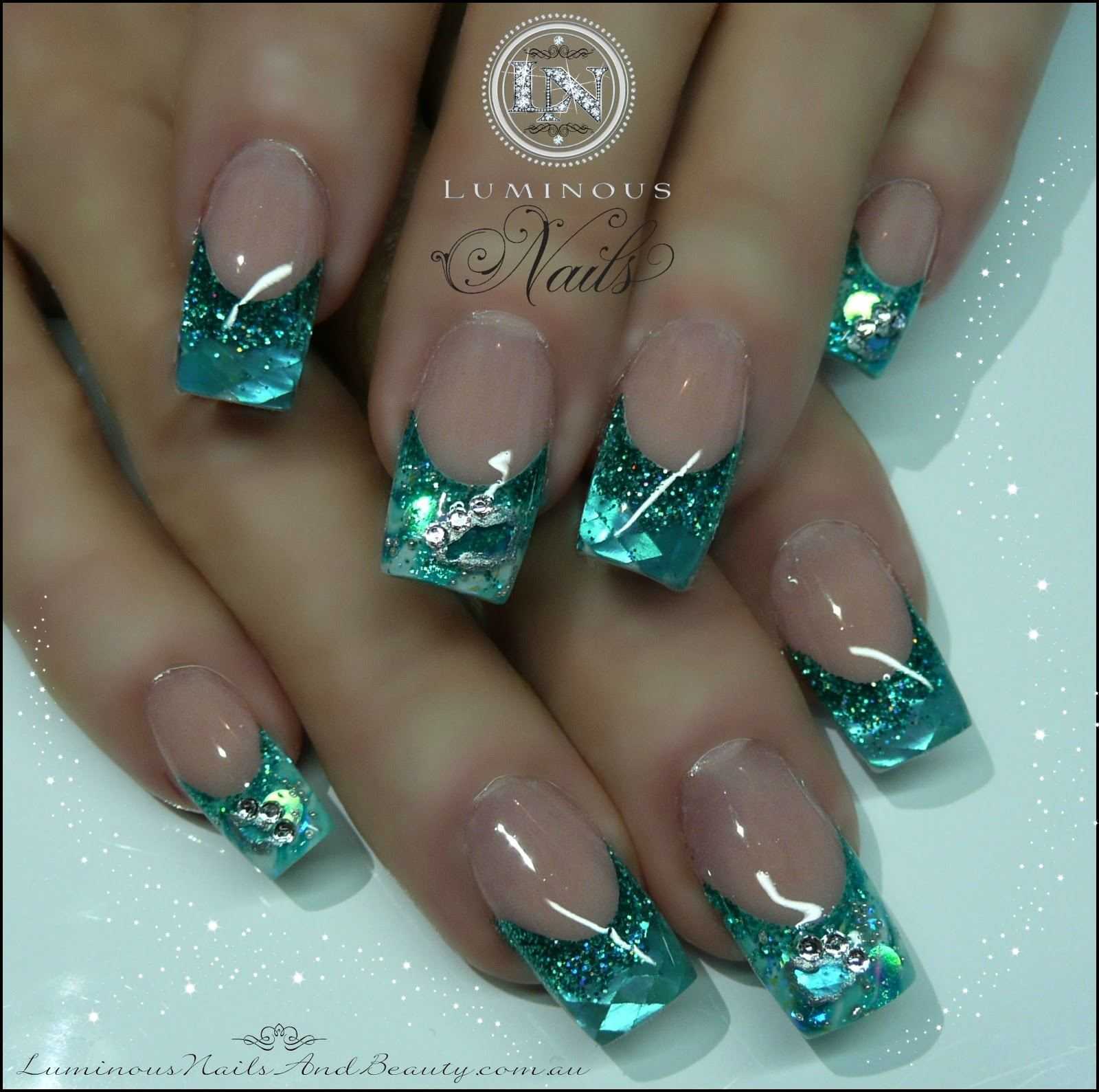 Как правило, в зеленом френче стразы размещают по краю ногтя, в области лунки или же покрывают весь ноготь. Стразы используют разнообразных цветов и разных форм. Главное правило, это учитывать длину ногтя. На короткие ногти не стоит применять большое количество блесток. Красиво и модно смотрится декор в стиле битого стекла. Такой маникюр создают с помощью разноцветной фольги в форме треугольников. Блестки используют сухие или жидкого вида. Блестками покрывают весь ноготь или же только лунку френча.