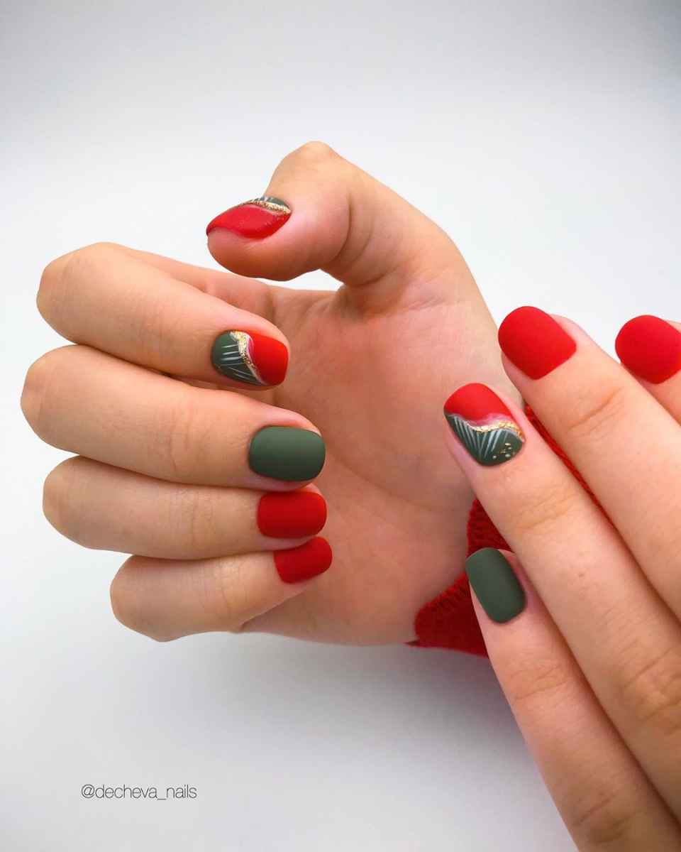 С красным сочетать зеленые очень сложно. Неправильно выбранный тон сделать маникюр не гармоничным. Вдохновляйтесь природой, там есть все подсказки. Ярко красному подходят густые и плотные зеленые, дополните маникюр блестками, фольгой или эффектом кошачий глаз.