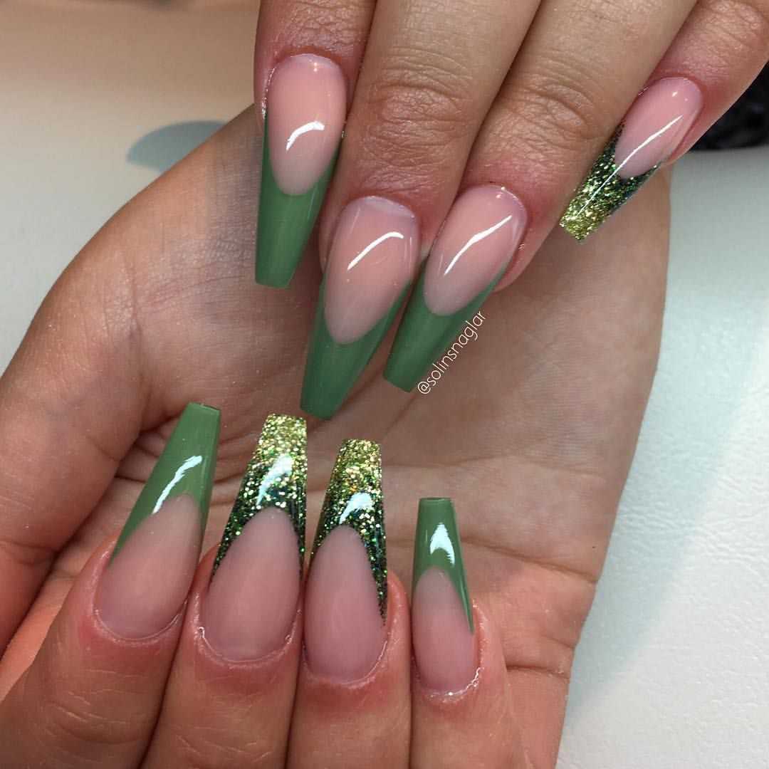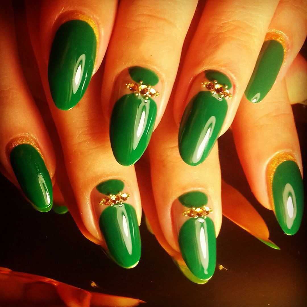 Зеленый цвет в маникюре придает женским ручкам строгость и шарм. Палитра зеленого состоит из множества тонов. Благодаря этому модницы могут с легкостью выбрать себе лучшие и притягательные оттенки. Для идеального маникюра главное ровность линии улыбки и аккуратность. Для такого маникюра подойдет любая форма ногтя и любая длина. При этом особенно красиво и аккуратно смотрится зеленый френч на длинных овальных ноготках. При этом декором не стоит увлекаться и носить такой маникюр с зеленым макияжем. Зеленый цвет не является универсальным под любое событие, нужно учитывать и то, что при выборе декора, весь образ должен быть гармоничным.