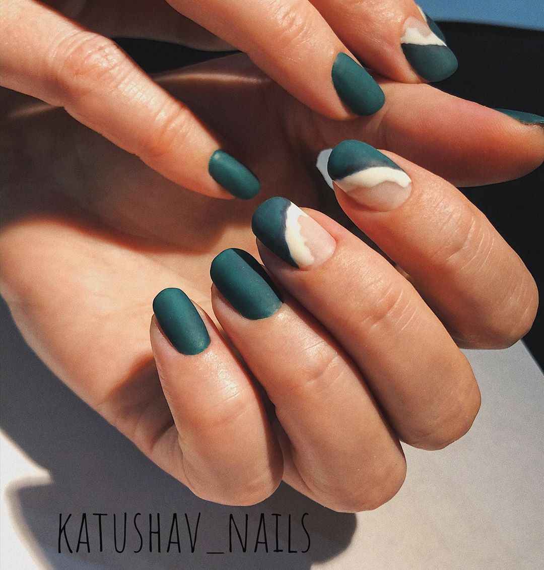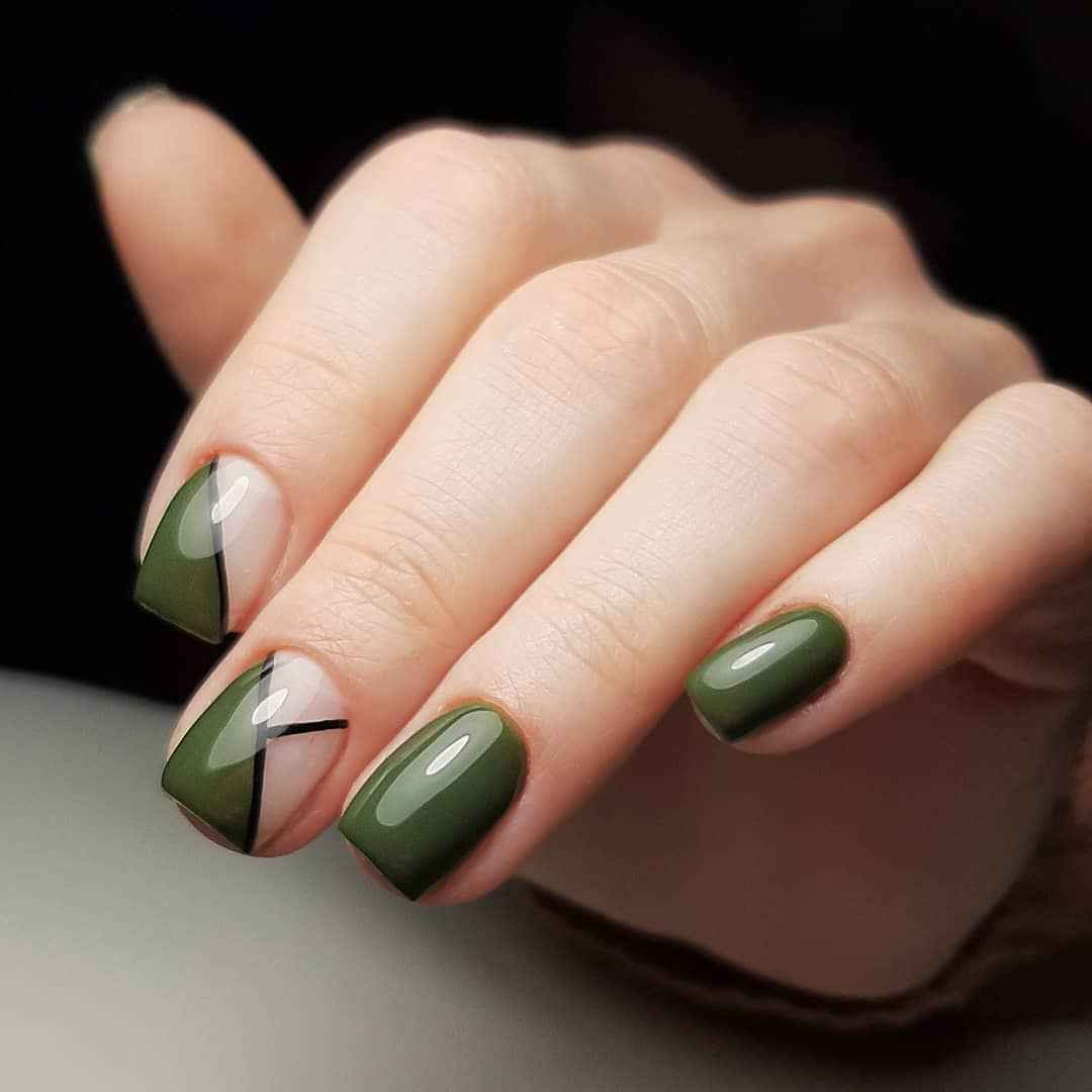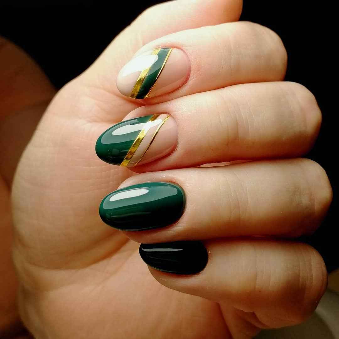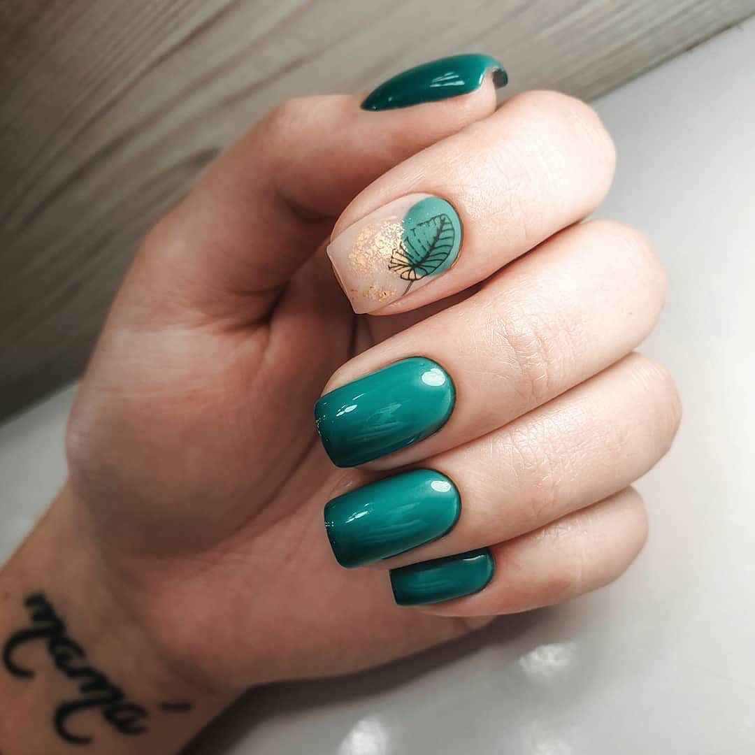 Темно-зеленый оттенок чаще всего выбирают для холодного времени года – осени или зимы, ранней весны. Но им также можно дополнить и яркий летний маникюр, прорисовывая им отдельные элементы или оттеняя более насыщенные, сочные цветовые «пятна».