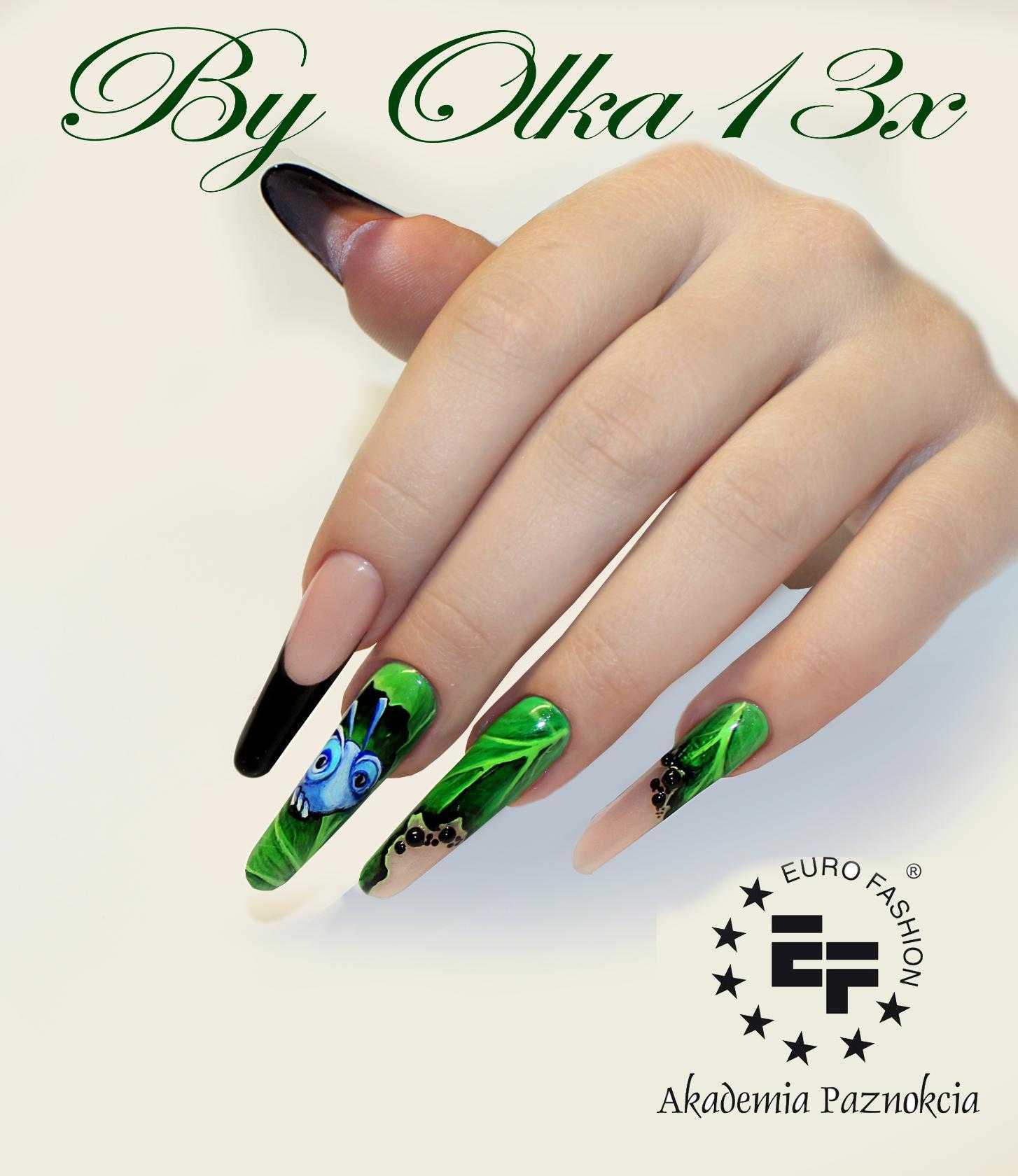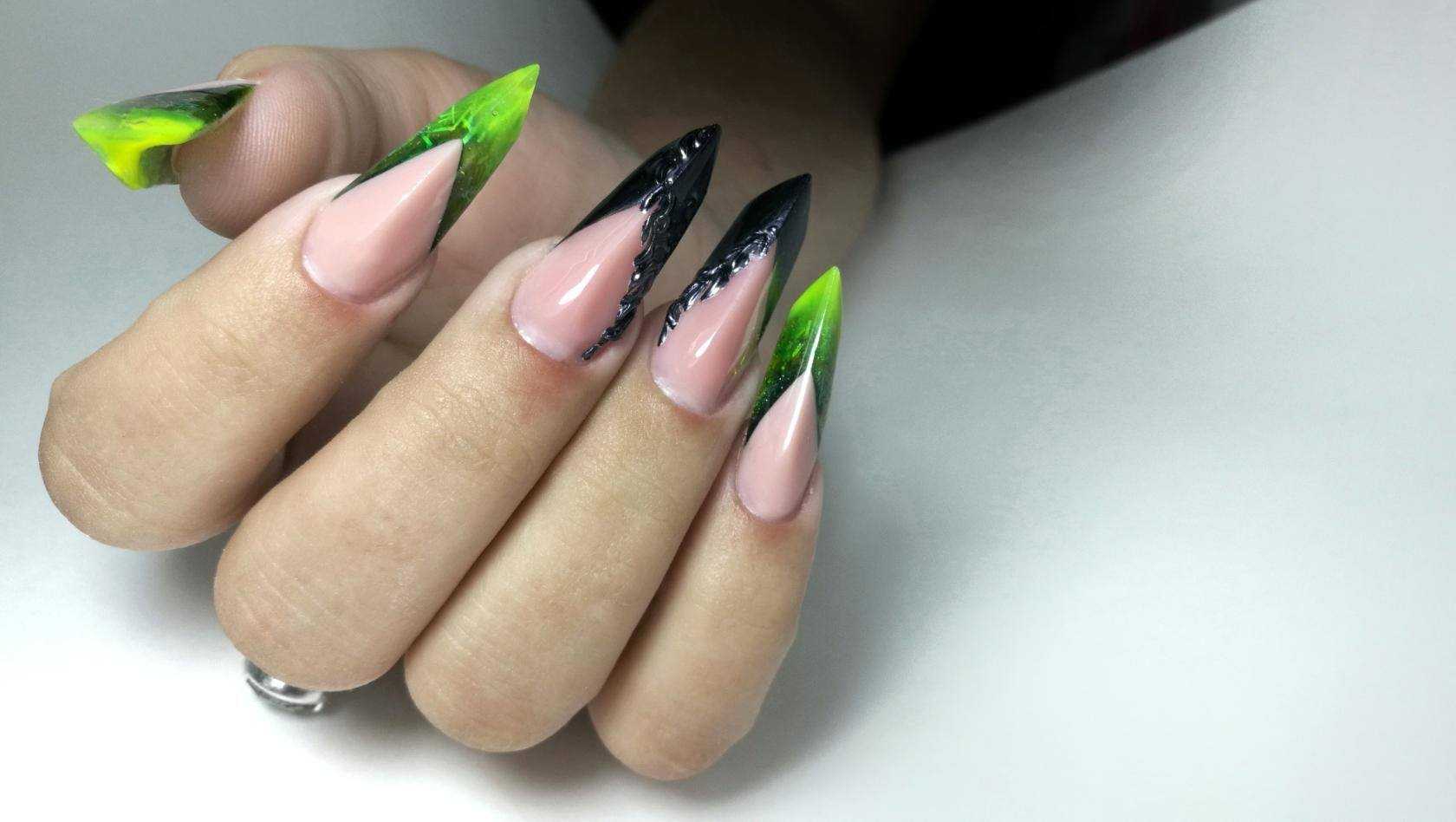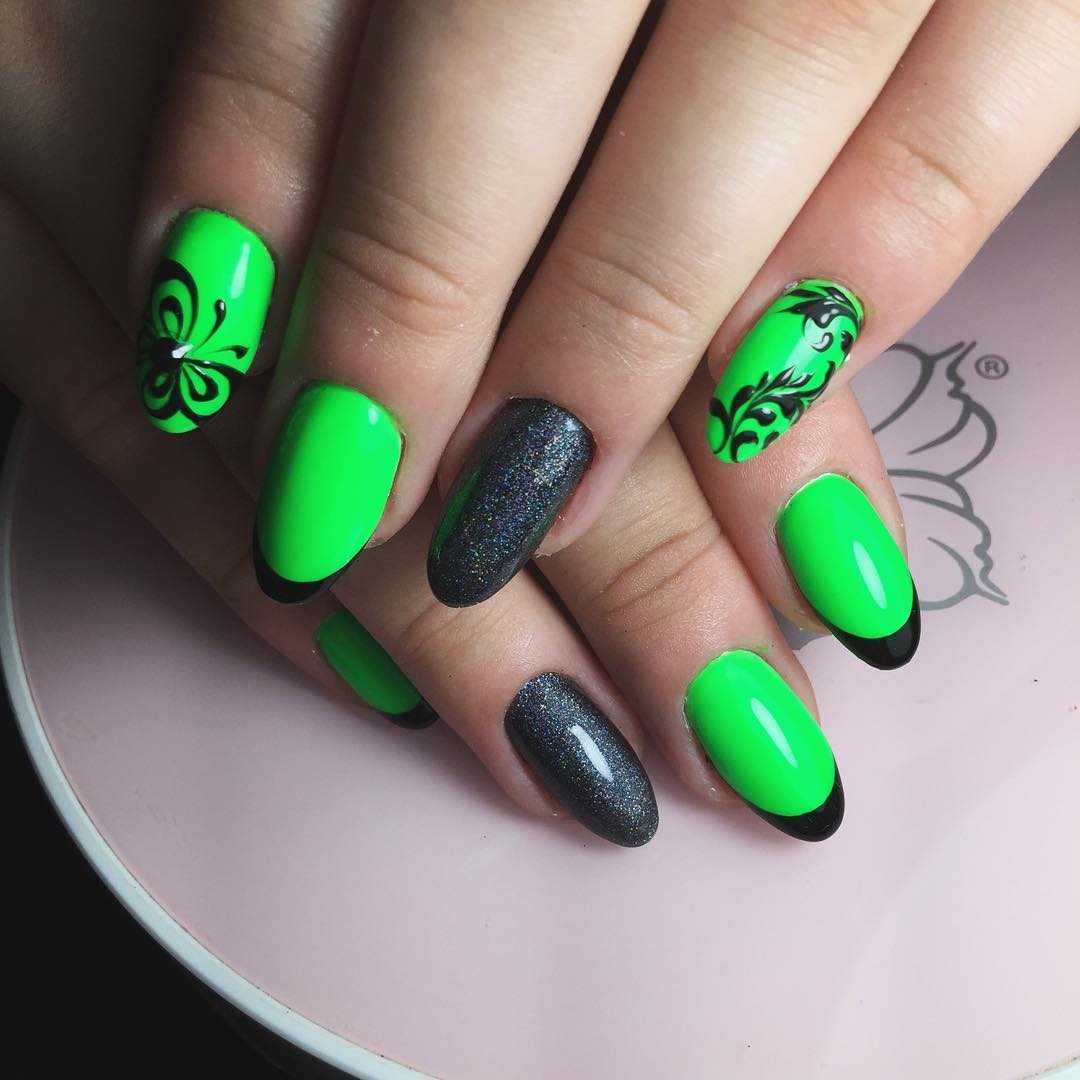 Черный маникюр модницы часто отвергают как очень мрачный. Сочетайте монохром с зелеными оттенками и ваш дизайн поразить индивидуальностью и необычностью. Отличные варианты — черная база и зеленая фольга, стразы, зеленая база с черными полосками пудрой или блестками.