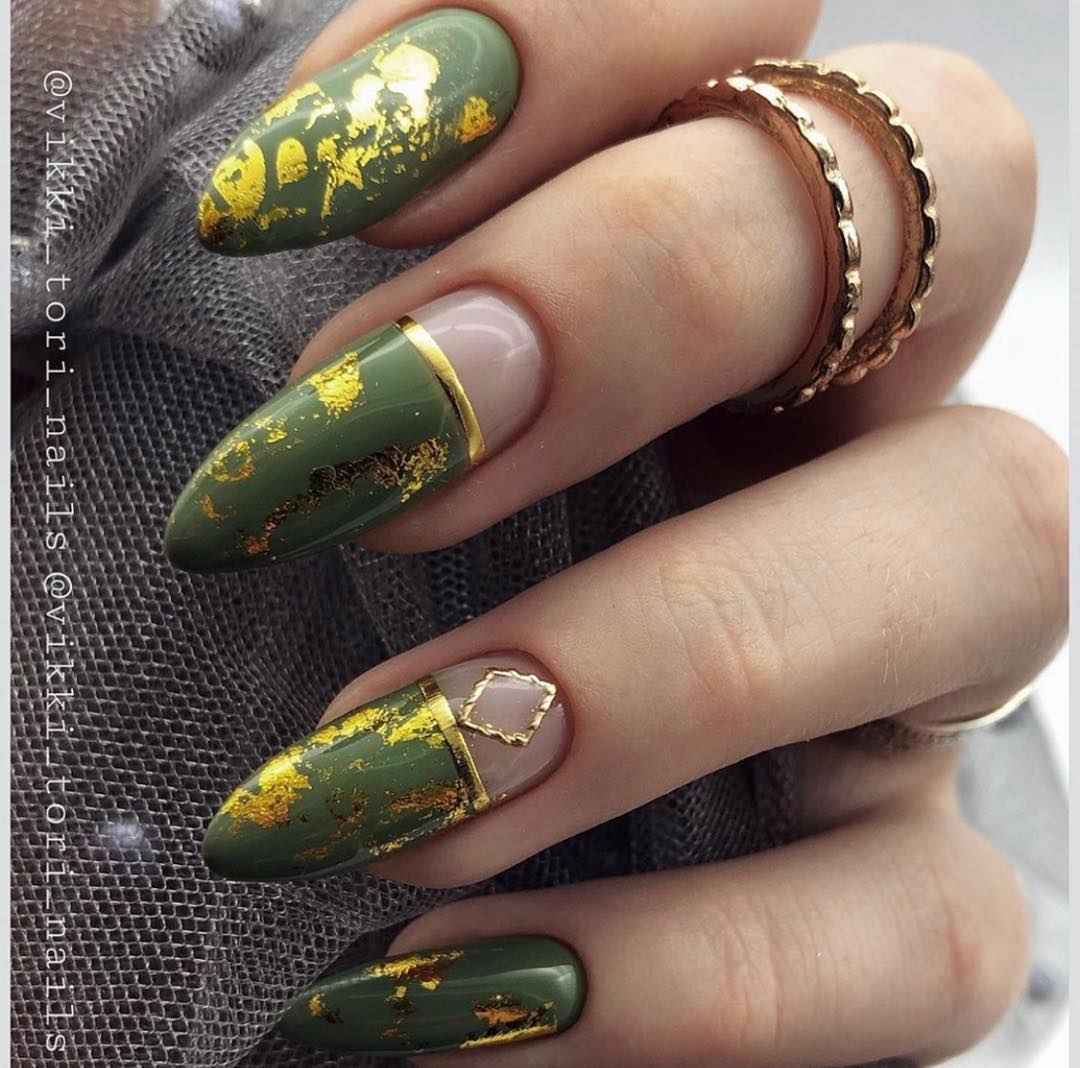Все оттенки зеленого идеально гармонируют с различными цветами, такими как синий, белый, желтый, синий, черный, красный, серый и бежевый. Главное правило при сочетании цветов – чтобы выбранные лаки гармонично смотрелись на ногтях. В этом году французский маникюр отлично сочетается с матовым покрытием. Салатовый цвет красиво и стильно смотрится со светлыми оттенками, создавая при этом красивый летний образ. Оливковый цвет можно нанести с матовым покрытием и украсить золотыми элементами. Болотистые и темные цвета хорошо гармонируют с белым и черным лаком. С бордовым, серым и коричневым цветами сочетают оттенок хаки. Чтобы окончательно дополнить выбранный образ, отдайте предпочтение золотым кольцам.