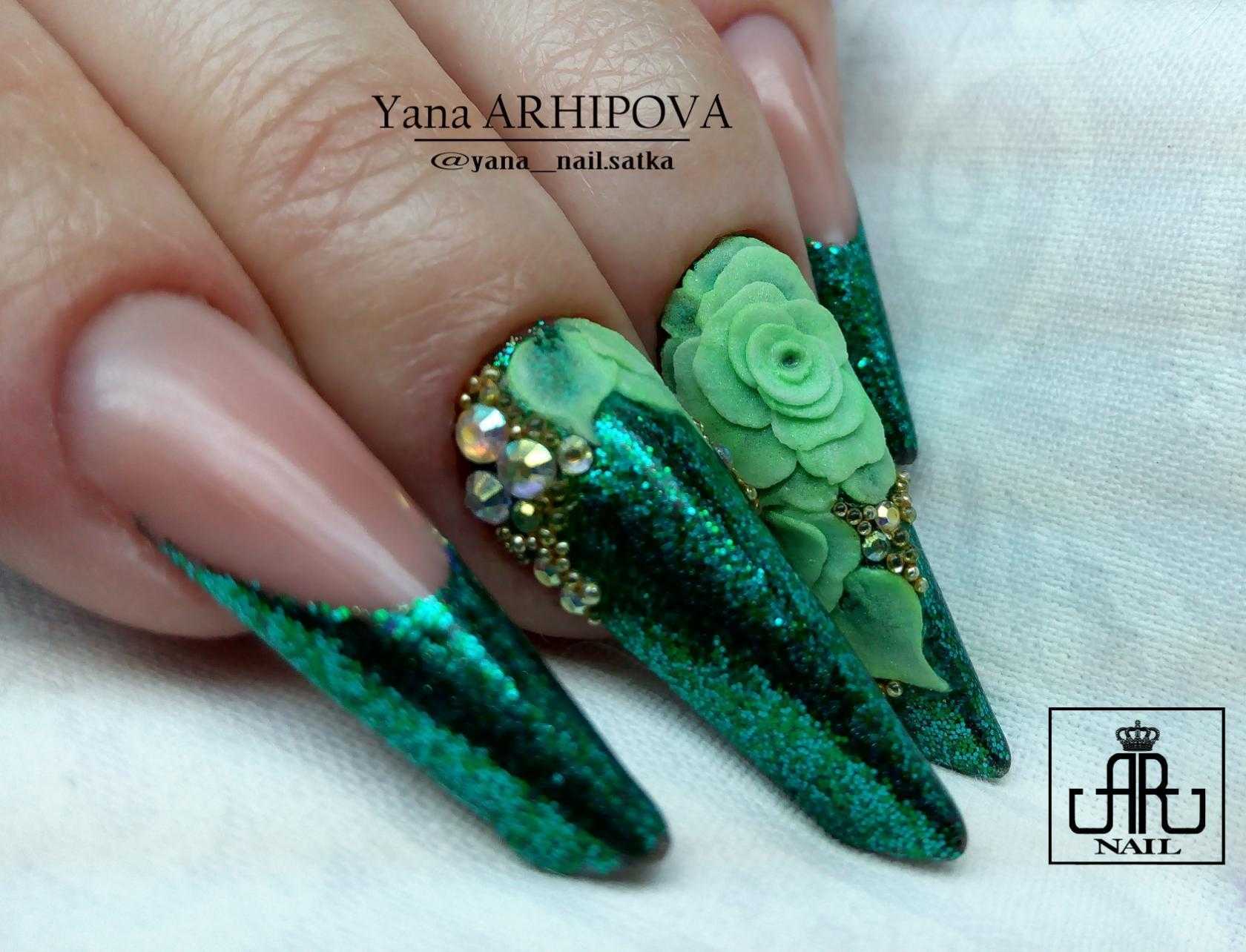 Зеленый цвет является одним из самых благородных и изящных тонов. Его очень часто применяют в оформлении стильного лука. Касаемо маникюра, он также встречается не редко и придает женским ручкам шарм и строгость. Палитра зеленного цвета состоит из множества тонов, начиная светлыми оттенками, заканчивая темным цветом. Благодаря такому разнообразию девушки смогут выбрать для себя самые удачные и притягательные оттенки. Чтоб дизайн выглядел привлекательно, очень важна аккуратность и ровность линии улыбочки маникюра. Зеленые тона подходят для любой формы и длины ноготков. Особенно восхитительно выглядят овальные длинные ноготки с зеленым френчем. Стоит отметить, что такой дизайн можно с легкостью выполнять при помощи дополнительного декора. Но не нужно увлекаться и использовать его чрезмерно много.