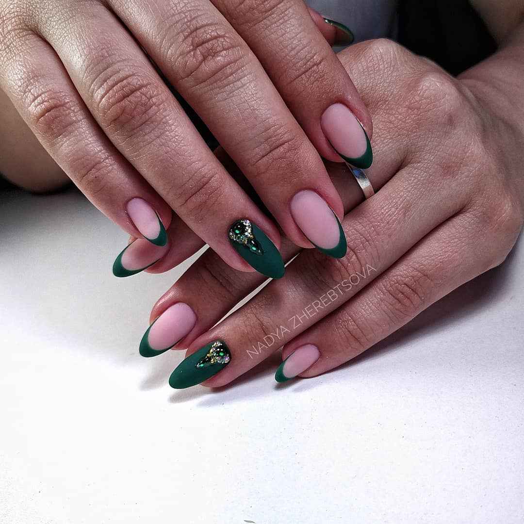 Маникюр в темно-зеленом цвете подходит как для повседневной носки и отлично сочетается с разнообразными женскими образами на каждый день, так и для праздничного look’a. Главное – подобрать соответствующий дизайн.