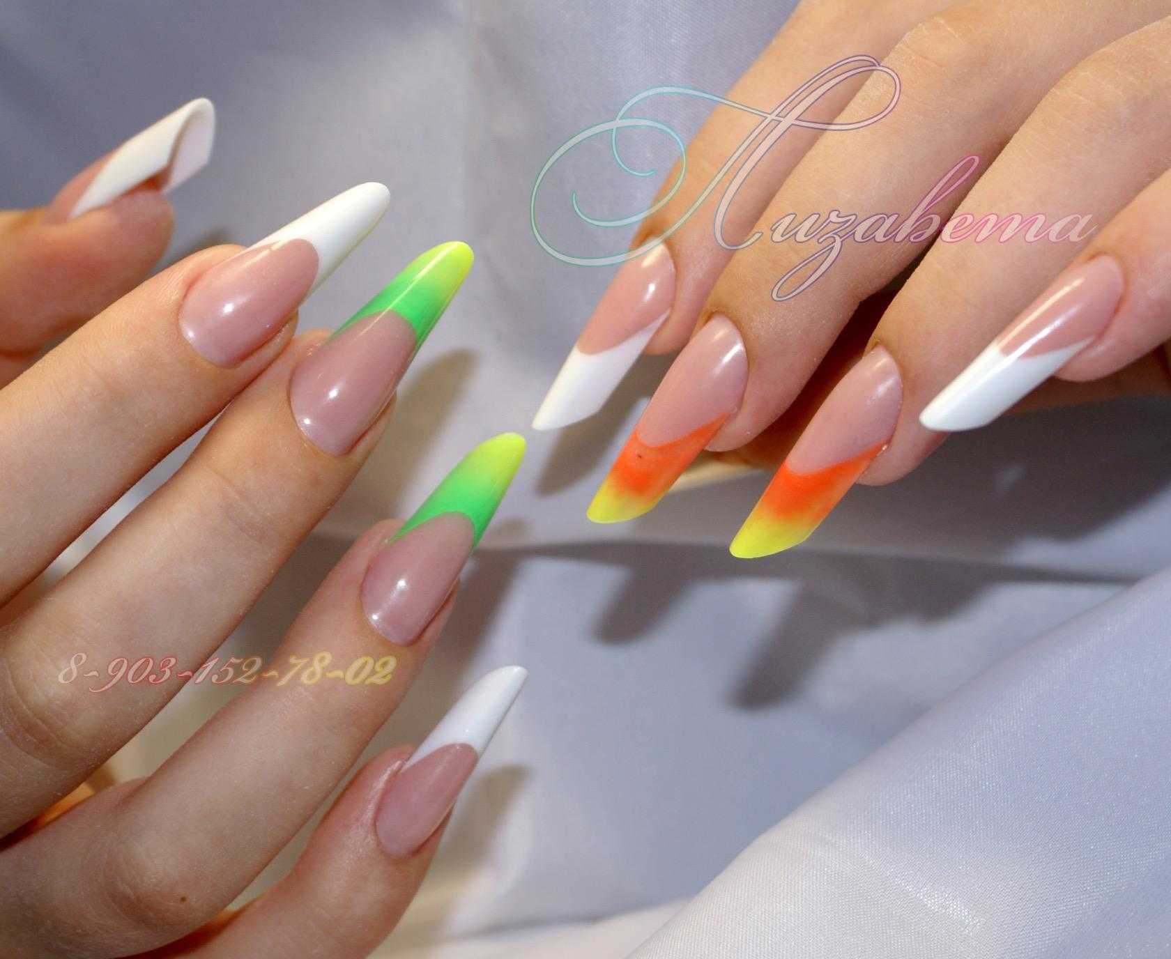 Омбре. Характеризуется применением двух контрастных оттенков, которые разделяют тонкой линией. При этом необязательно делать четкие переходы между цветами. Подобный дизайн создают в градиентной технике. Интересным вариантом считается и отделение ярких оттенков двумя полосками: их нужно рисовать под острым углом. Для вечернего образа рекомендуется комбинированный френч: на одном или двух пальчиках следует рисовать классическую «улыбку», а кромки остальных ногтей выделить изогнутыми цветными линиями, расположенными хаотично.