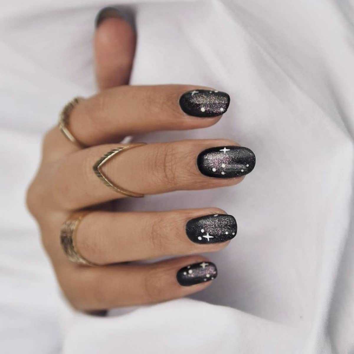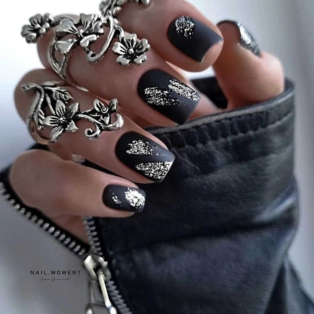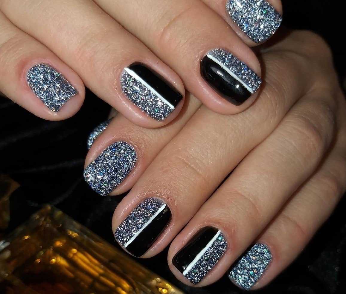 Поменяйте обычную округлую форму на асимметричный квадрат и завершите черным контуром, украшенным блестками или стразами – модный маникюр готов! Черный цвет достаточно универсален, поэтому такой маникюр легко впишется в повседневный образ, а блестки придадут ему легкость и беззаботность.