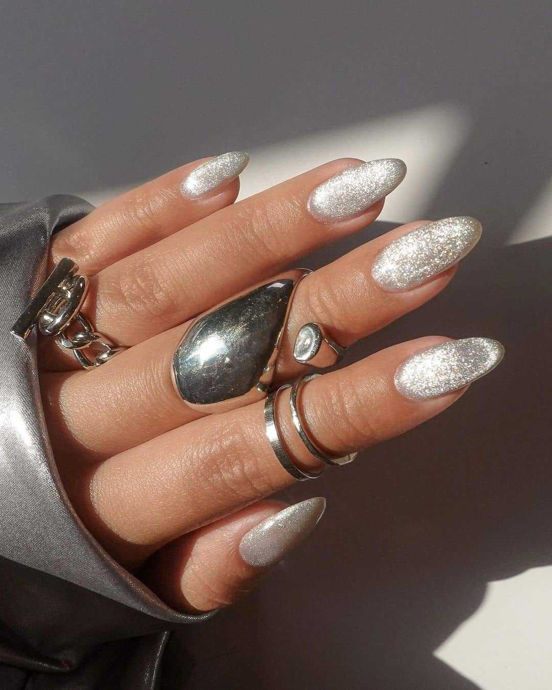 Светоотражающий маникюр на ногтях миндального формата может выглядеть очень красиво и необычно. Светоотражающие лаки могут иметь различные оттенки и эффекты, например, голографический блеск, мерцание или металлический оттенок.