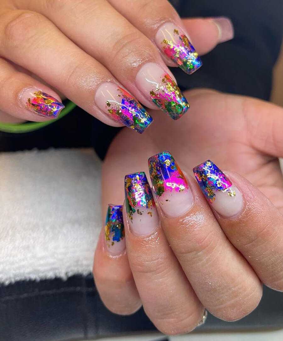 Разноцветные отблески привлекают внимание окружающих. При таком ярком акценте не рекомендуется перегружать маникюр лишними элементами декора, но можно дополнить небольшими бульонками или стразами