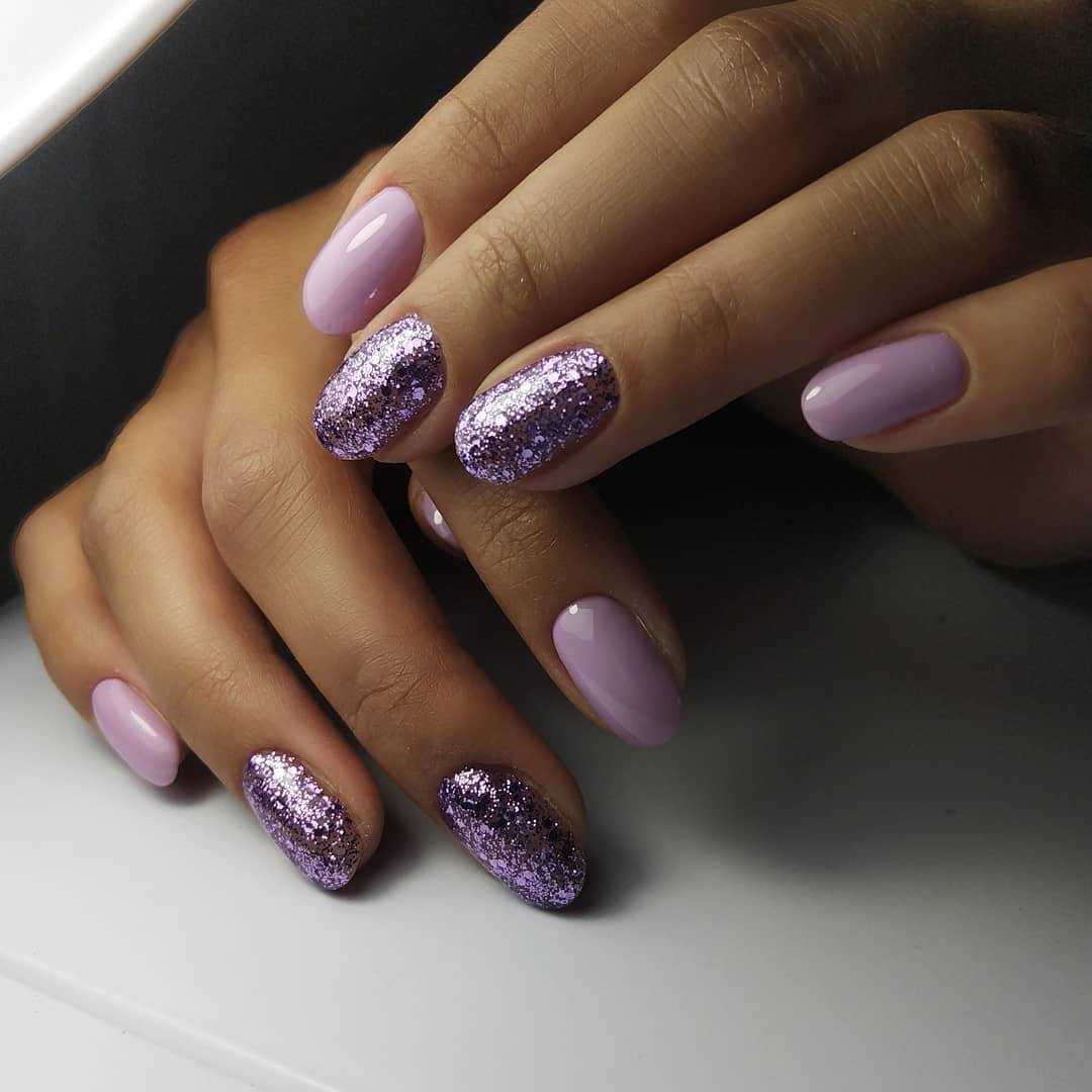 Самым удачным решением будет выбор двух сиреневых нежных тонов разной насыщенности, что освежит маникюр. При желании декор в цвет матового или глянцевого покрытия может завершать дизайн.