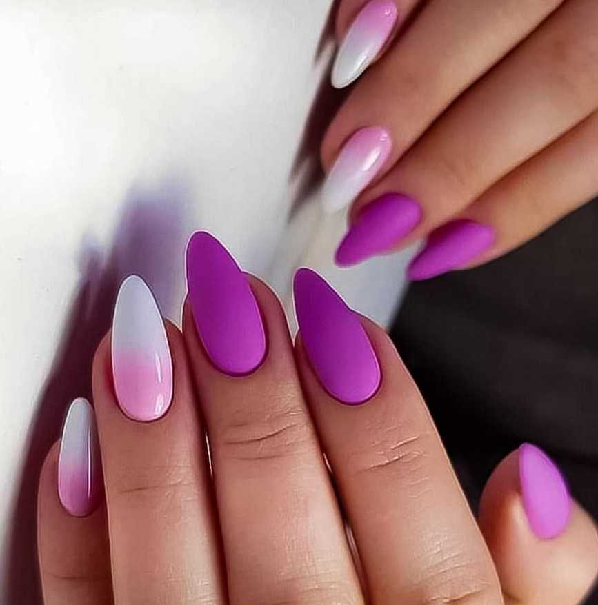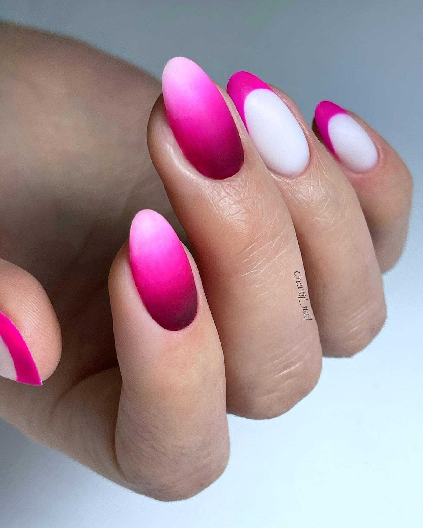 При желании сделать омбре, белый с розовым необязательно должны оставаться в рамках классических оттенков и эффектов. Матовые версии такого дизайна выглядят по-настоящему восхитительно.