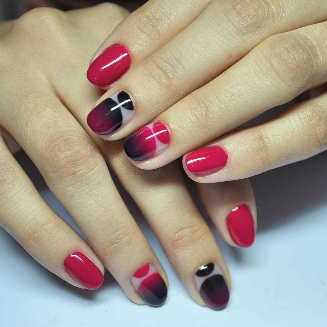 Красный лак — яркий и страстный. Если хочется немного разнообразить дизайн — сделайте градиентный маникюр в красных тонах. Начать можно с розового, а закончить фуксией. Другой вариант — растяжка от красного к черному или наоборот.