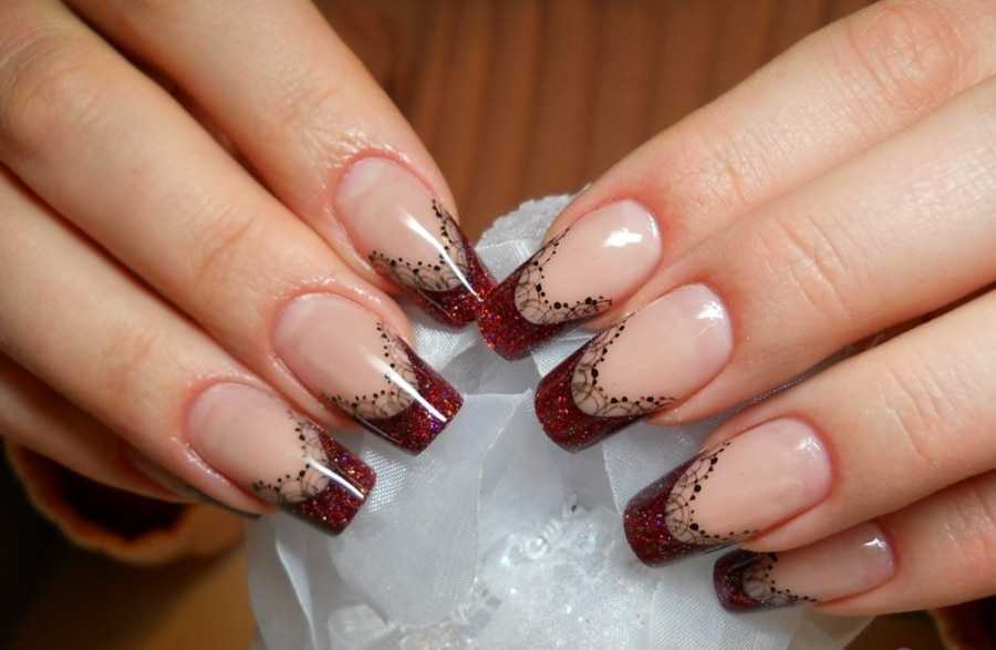 К бордовому платью подходит молочный, розоватый и светлый тон во французском стиле. Если женщина теряется в выборе, то нужно создать универсальный маникюр, который подойдёт как для дневного времени, так и для вечера. Прозрачный лак наносить проще всего, не требуется точности. Недостатки не будут столь заметными, как при ярких оттенках.