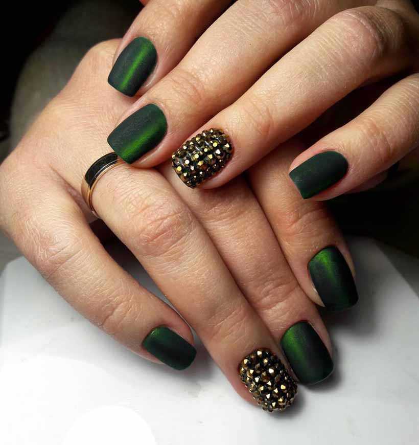 - Оформление с использованием двух видов темно-зеленого покрытия: глянцевого и матового. Ногти окрашиваются в технике френча. Основная часть пластины делается матовой, а полоска — глянцевой. Несколько пальцев можно украсить стразами.
