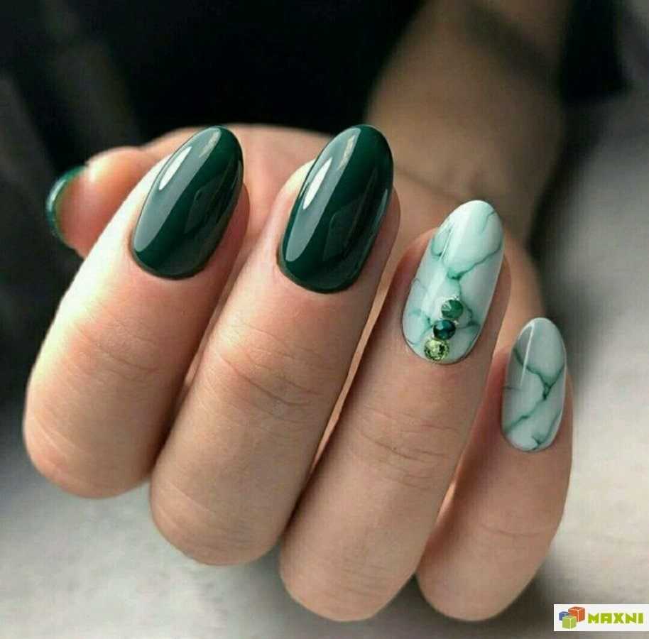 В мраморном маникюре красиво смотрится серый, розовый, зеленые оттенки. Изумрудный мраморный маникюр станет отличным дополнением вашего образа