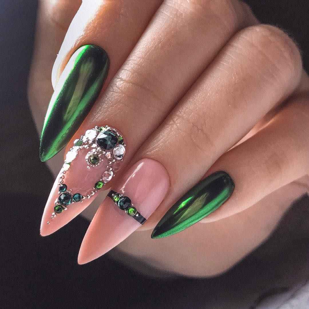 Изысканный изумрудный дизайн на овальных, миндалевидных или квадратных ногтях позволяет декорировать их геометрическим, растительным или фантазийным узором. Интересное решение – использовать технику голографии.