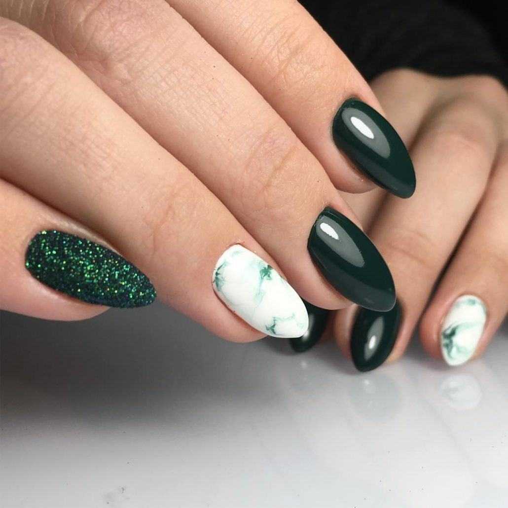 Чтобы сочетание изумрудного и белого выглядело интереснее используйте матовую текстуру, декор фольгой, стразами. Красиво выглядит дизайн “битое стекло” в изумрудном цвете. Помимо белого цвета используйте в дизайне кремовый, светло-серый, полупрозрачный и другие оттенки. Они сделают дизайн объемнее и оригинальнее.