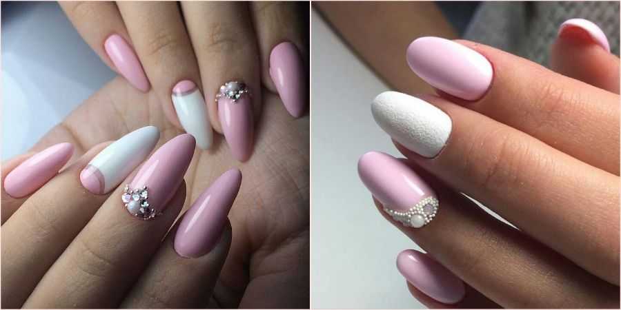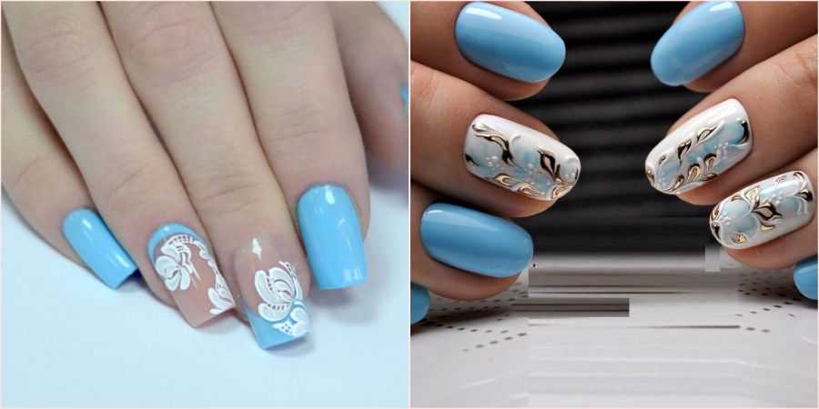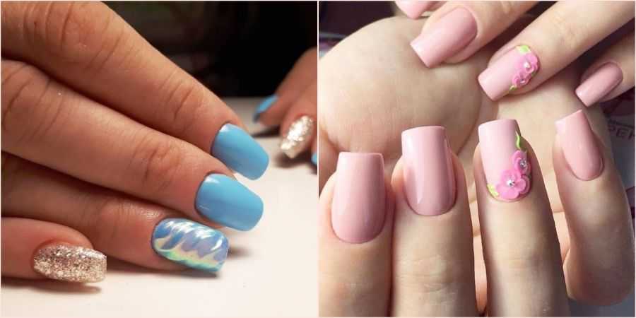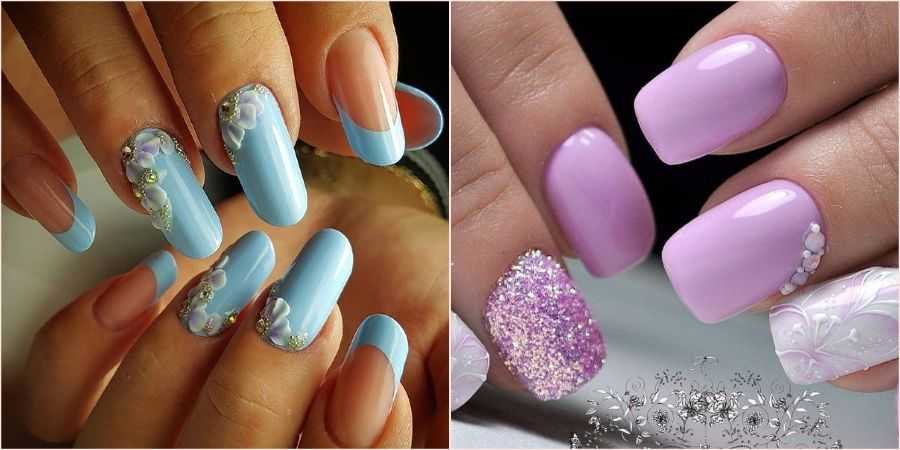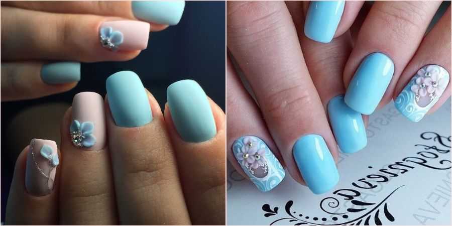 Шикарно выглядят ноготки розового или голубого в дополнении с лепкой, стразами, лунным маникюром, росписью, «сахарком», градиентом, лентами или блестками.