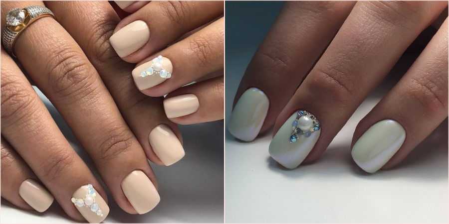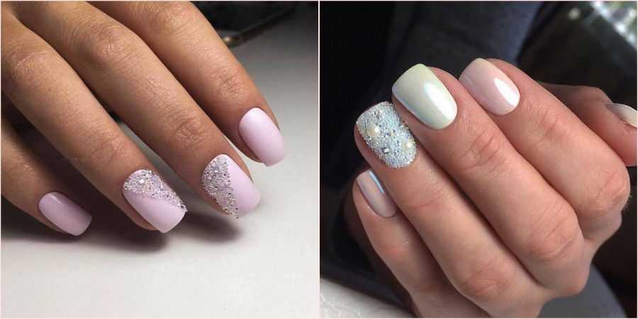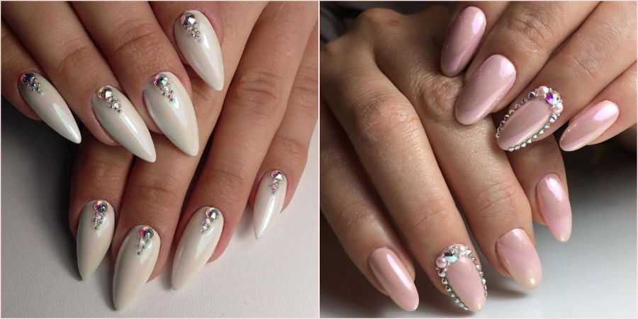 Эти мелкие блестящие камушки очень красиво мерцают на солнце и в искусственном свете, привлекая внимание к рукам невесты. Однако современная мода предполагает размещение таких украшений на отдельных ногтях, ни в коем случае, не на всех, иначе это будет выглядеть не нежно и привлекательно, а вульгарно.
