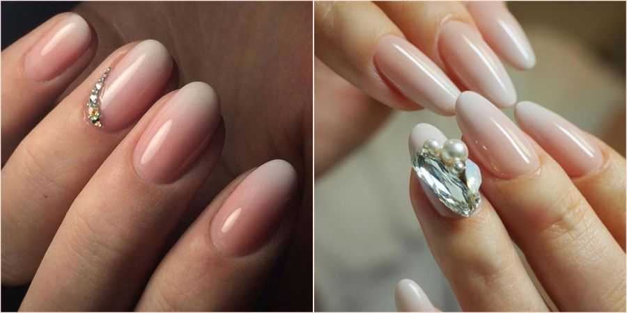 Это красивый и нежный переход цвета, который смотрится очень утонченно на ногтях любой длины. На свадьбу принято его делать в нюдовых оттенках, а дополнить дизайн можно чем угодно: и лепкой, и стразиками, и вензелями.