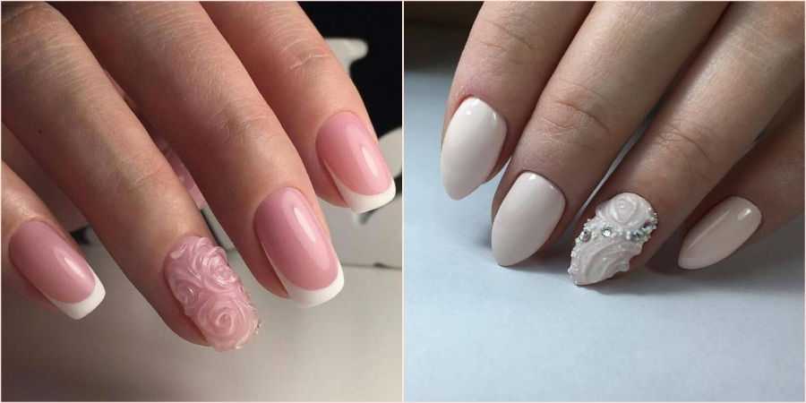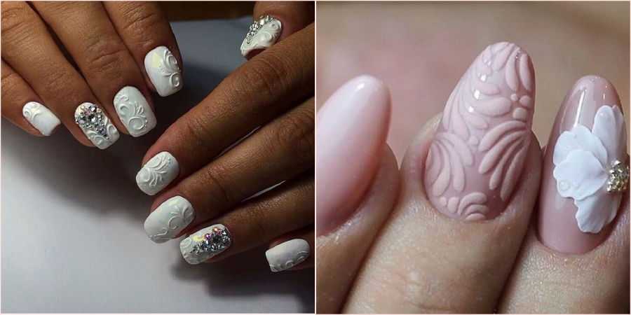Наверное, это самый оригинальный и эксклюзивный дизайн. Профессиональные мастера делают невероятно красивые 3D рисунки, которые смотрятся эффектно и шикарно. Популярные идеи для лепки на свадьбу – это цветочки, бантики, ракушки, узоры и вензеля.
