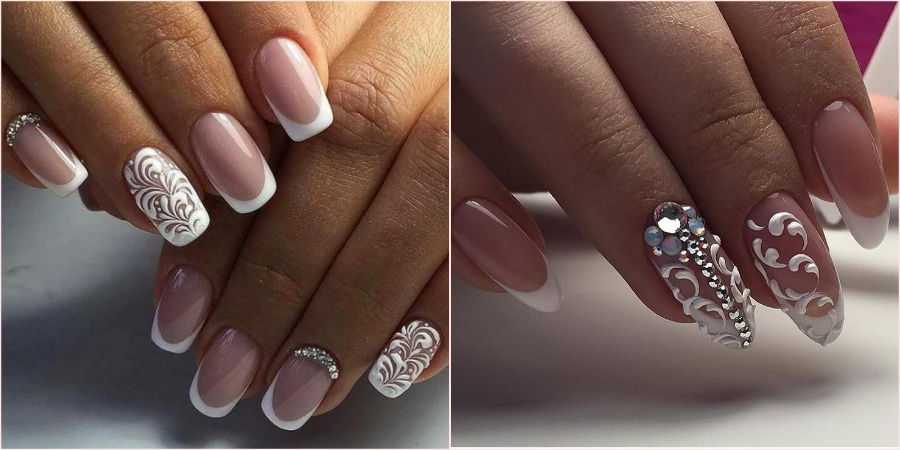 Еще один популярный и часто выбираемый дизайн для свадебного торжества – это рисунки в виде вензелей. Очень нежно сочетать их с френчем, стразами небольшого размера и с белым цветом.