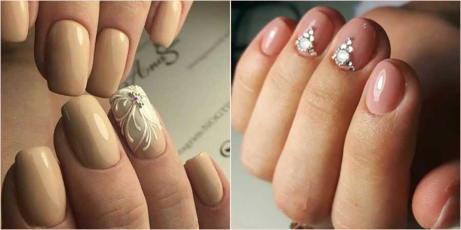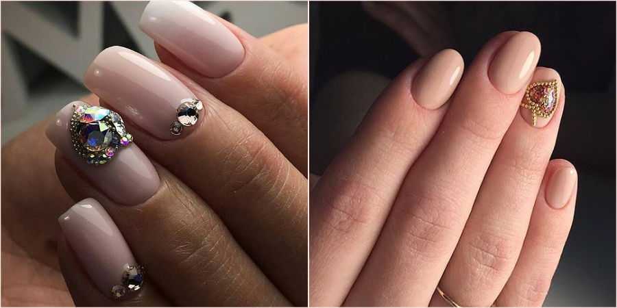 Натуральные нюдовые оттенки в маникюре по праву занимают лидирующие позиции уже долгое время. Они сочетаются с любым цветом в гардеробе. Дизайн может быть самым разнообразным: от украшения одной-двумя стразами до россыпи камней на одном из ногтей.