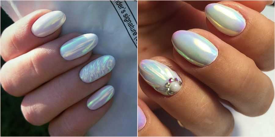 Такой дизайн стали делать не так давно, но он уже полюбился многими девушками. Красивое жемчужное переливание смотрится шикарно как на всех ногтях, так и на нескольких. Втирка замечательно может выступать и как самостоятельный декор, и с дополнением стразиков, «сахарка», вензелей, блесток или геометрии.