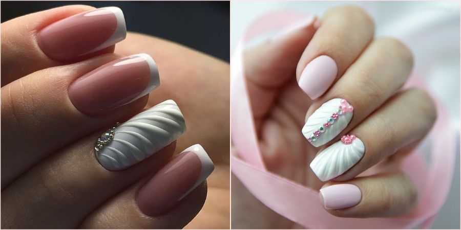 Орнамент в виде ракушки выполняют в светлых оттенках и чаще всего на двух ногтях, цвет рисунка используется такой же, как и для всех остальных пальцев. Декорируют дизайн бульонками, стразами или блестками.